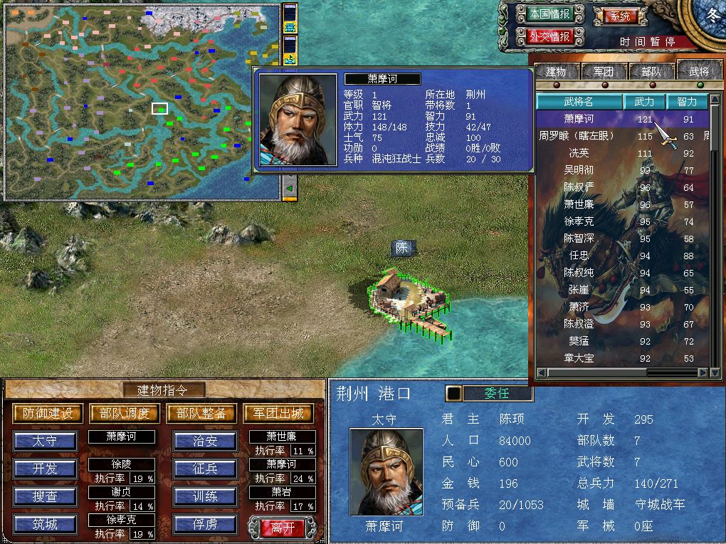 北齐和北周这两大BOSS级势力的核心将领,我在之前的文章里已经进行了详细展示,这里自然就要轮到制霸东南的陈朝了。以陈顼为君主的南陈势力,开局占据了16处据点并拥有83名部将,综合国力仅次于北齐和北周,可以算得上是这个版本里的老三。 尽管放在北方双雄的面前,南边的陈朝稍低了半个咖位,不过至少他们在长江以南是绝对的霸主。肉眼就能看得出,南陈周围几乎是不存在天敌的,而且他们的码头还非常多,开局阶段吃下宝