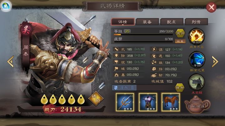 直入主题,武将搭配是,许褚,甘宁,诸葛亮。这个阵容以甘宁为核心,带上雄兵破败和折戟强攻,甘宁自带天赋必定先手,加上主动技能增加20概率,配上两个高伤害群伤,是这个阵容的核心。许褚的作用是减属性,然后适当补一点伤害,作为补充伤害位。诸葛亮我佩戴的是两个减伤,加上诸葛亮自带的沉默技能,最大限度在前2—3个回合打出兵力差。强度不错,大家可以试试