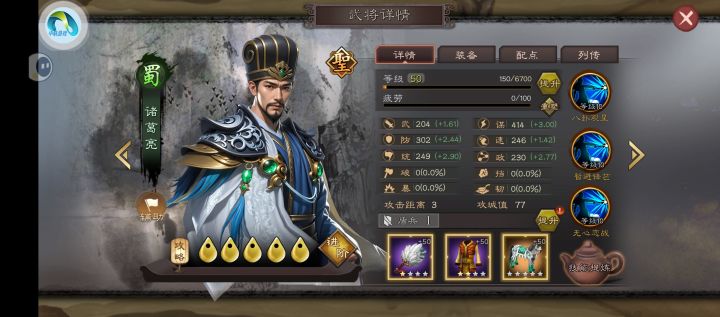直入主题,武将搭配是,许褚,甘宁,诸葛亮。这个阵容以甘宁为核心,带上雄兵破败和折戟强攻,甘宁自带天赋必定先手,加上主动技能增加20概率,配上两个高伤害群伤,是这个阵容的核心。许褚的作用是减属性,然后适当补一点伤害,作为补充伤害位。诸葛亮我佩戴的是两个减伤,加上诸葛亮自带的沉默技能,最大限度在前2—3个回合打出兵力差。强度不错,大家可以试试