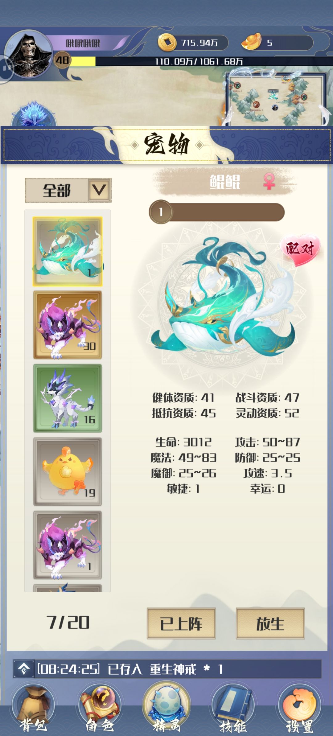这游戏就是宠物为主的,后期装备在强也没一只宠物好用,我已经超过一周没见到坤坤和焰尾灵了,后期真心没法玩了啊,曾经没实力,现在是没那命啊 现在说说攻略 开局抓一只龙宝宝练级,14级学毒后买999小蓝抓灵魂酋长、紫焰灵猫、海梦飞马,这仨属性都差不多,瞅准一种抓,弄成金色前期就基本够用了。 后期防御超100准备两复活戒指就能抓坤坤和焰尾灵了,战斗中换复活戒指可以舜回满血满蓝。 在说说升级和装备,升级就挂