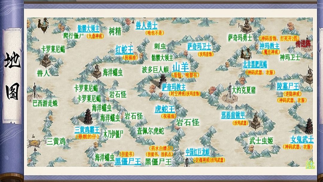 说说攻略 开局抓一只龙宝宝练级,14级学毒后买999小蓝抓灵魂酋长、紫焰灵猫、海梦飞马,这仨属性都差不多,瞅准一种抓,弄成金色前期就基本够用了。 后期防御超100准备两复活戒指就能抓坤坤和焰尾灵了,战斗中换复活戒指可以舜回满血满蓝。 在说说升级和装备,升级就挂机尸王,祝福油就挂机小蛇蛇,等有一定实力能搞定一图内所有BOSS了,就挖宝。个人觉得没必要挖金宝图,银的出货不比金图差。宝图内宝物排名