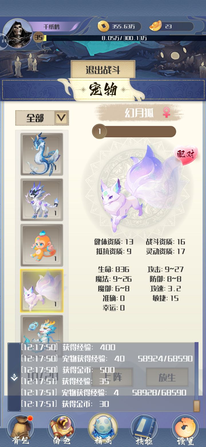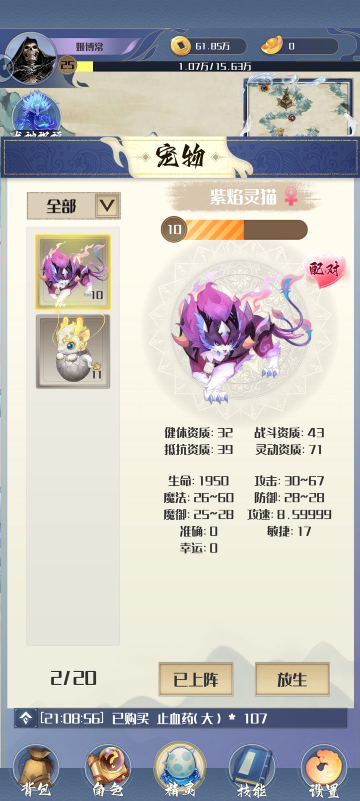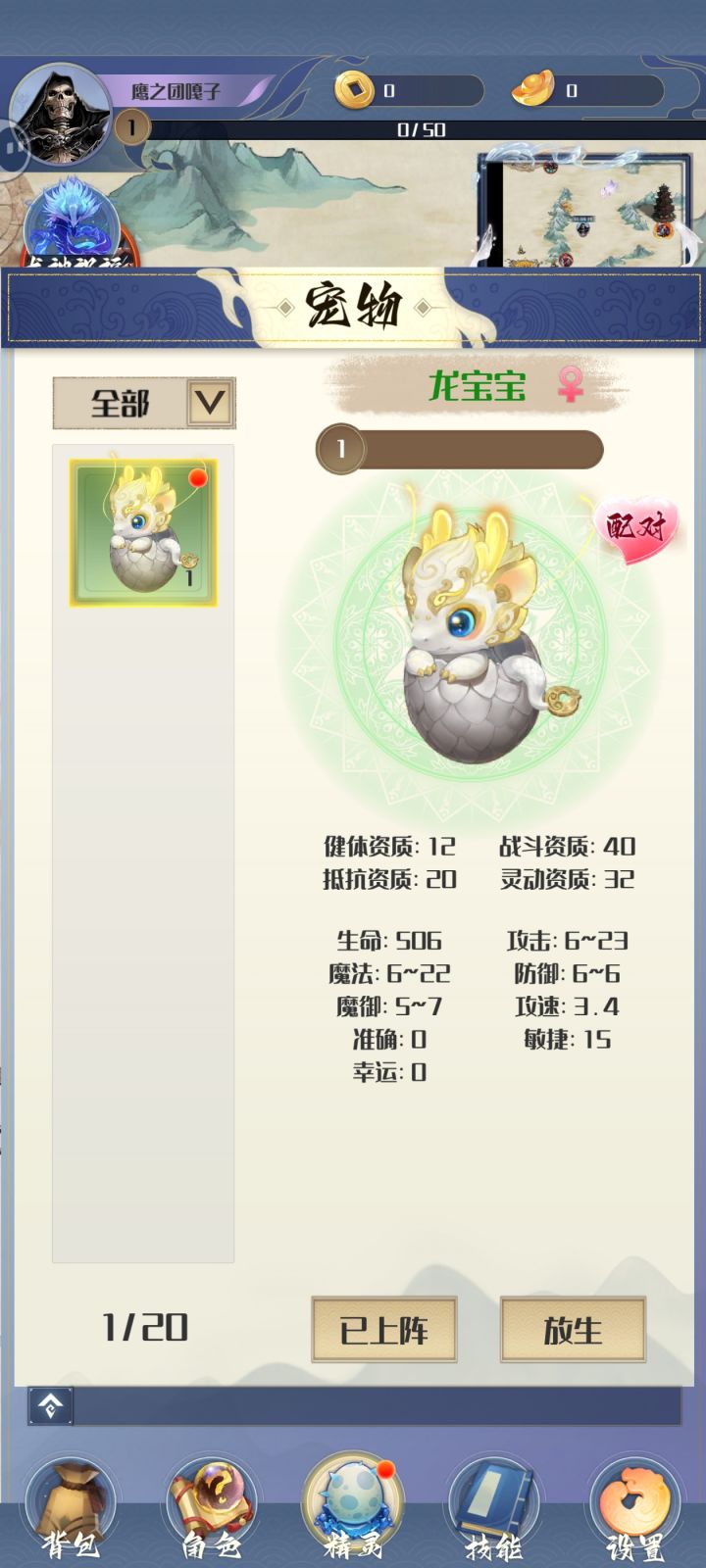 宠物篇捕捉道具: 精灵球、超级球、高级球、先机球(bug球,不找相信道具描述)道具获取: 商城购买、boos掉落、宝图掉落捕捉技巧: 宠物血量越低,捕捉成功率越高新手建议: 新手开局先捕捉龙宝宝即可,到了14级学会噬魂道法后,可尝试捕捉海梦飞马、紫焰灵猫宠物配对:需要两只相同种类等级达到20级可进行配对,配对后原宠消失, 获得等级1新宠。配对后的宠物资质、品质,高于上一代。(例