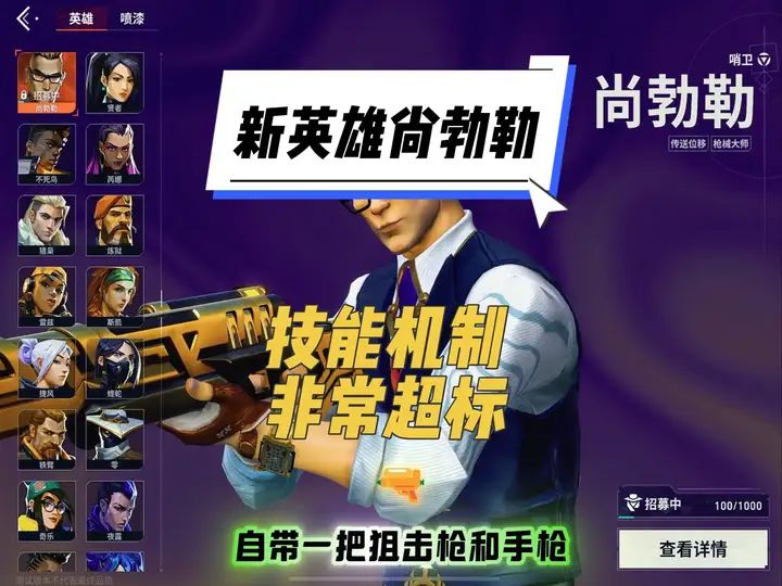 新英雄尚勃勒自带狙击枪和手枪,非常超标,值得练