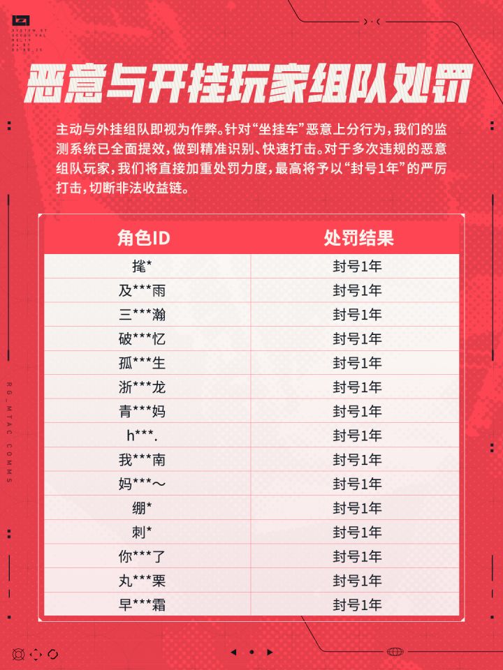 尊敬的玩家:大家好,我们致力于打造公平竞技的游戏环境,守护每位玩家的游戏体验。无论是【外挂、坐挂车、外设】等作弊行为,还是【炸鱼、恶意伤害/干扰队友、挂机逃跑、辱骂】等影响玩家体验的恶意行为,我们都密切监测并严厉打击,以下为【3/27-4/02】的处罚情况#无畏契约手游 #瓦手开学季 #瓦手破棘新生
