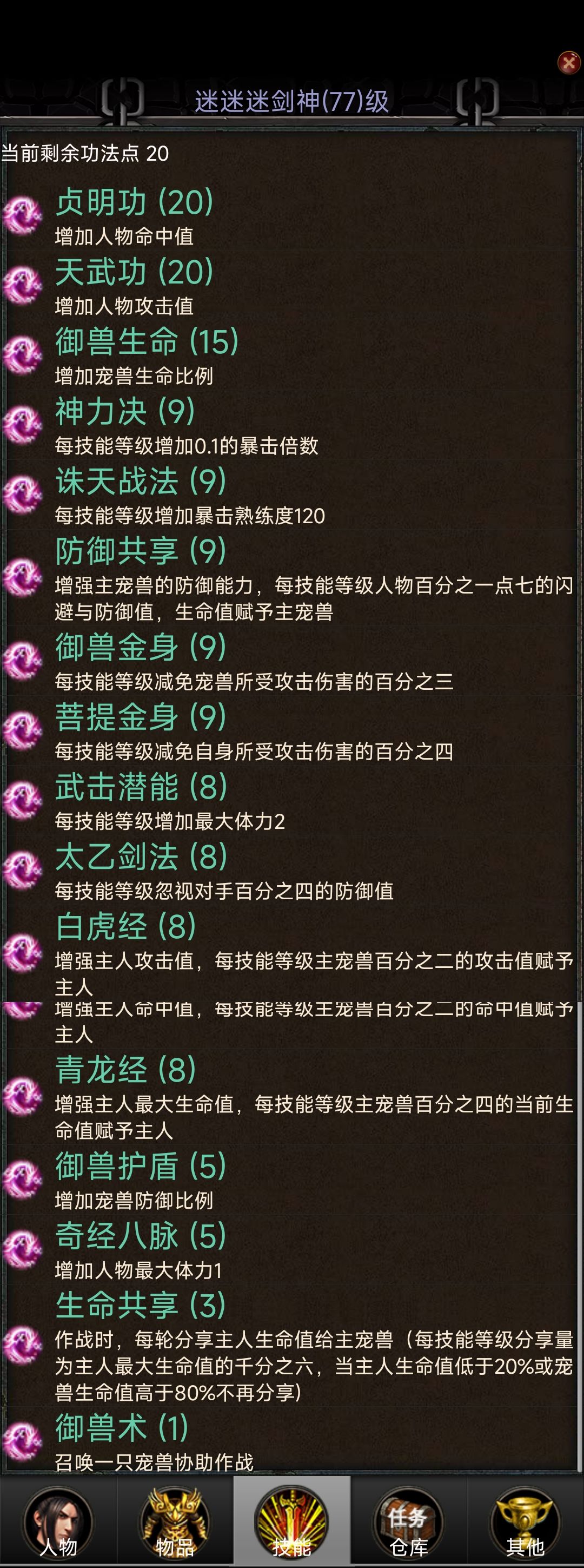 我玩的是武修前期也走了不少弯路也算是肝到了60级 武修第一个就是关于升级加点主修主要加点命中跟攻击,我加的是全攻击也可以半命中半攻击的加,有条件的可以把天运买满,就比较舒服了。 第二个就是关于功法,我学的技能图片上都有,算是武修比较主流的技能,后续还有一个共享生命,(我还没打到),至于怎么加点各人有各人的理解。像是北冥神功跟追魂灭魄目前版本不太建议学,比较鸡肋。 第三个,就是装备,武修的装备主