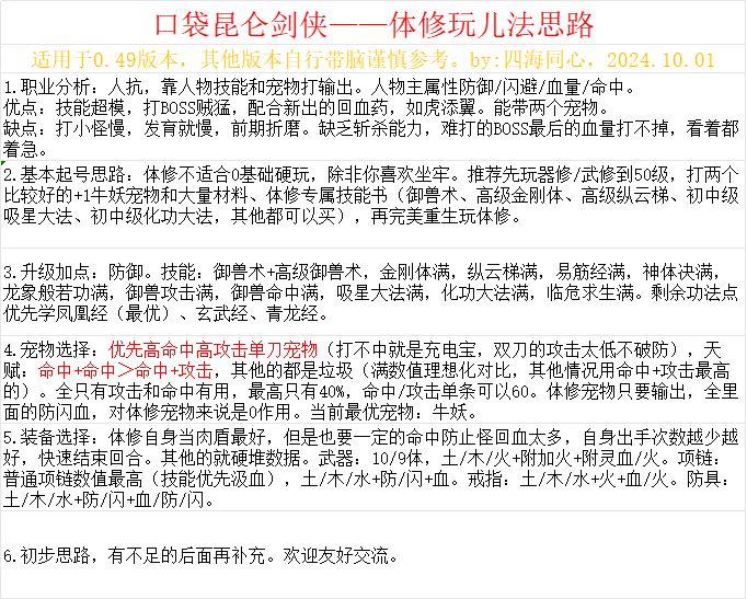 昆仑山:不推荐一上来就玩体修,开局新建角色,查看背包初始金币数量,越多越好,爆率高(玄学),然后刷几件绿色装和钱买个烧鸡,过了那几个新手boss就可以走出昆仑山。鸡公岭:打66个丑八怪解锁左下多宝谷,里面有多宝龟(挑战加金币)食人兽不用打,御兽术爆率很低。野狼谷:七头蛇掉御兽术,爆率高。泉水岭:三阶宠物推荐龟 蛇,随便抓一只就行。泉水谷:挑战密保怪,千山山龟解锁后面地图,过不去就刷点极品装