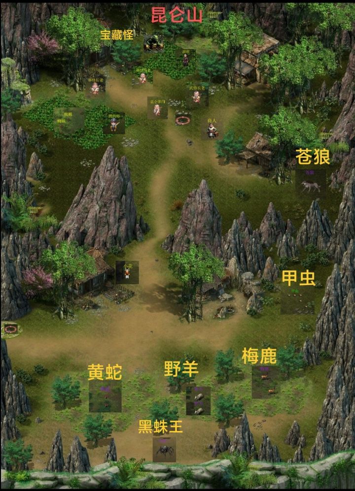 详细地图看后面地图篇或者游戏群相册查看★开局篇远山游戏100块钱买十个牌子是相当划算的,牌子可以增加爆率和仓库容量★正式篇(流程及地图)◎昆仑山:开局后每个人背包送有金币数量随机。可以去商人那购买血药(最便宜的那个)再买把武器就可以轻松刷蜘蛛了。先去出生点左边菜地去刷蜘蛛除了击杀掉落金币还有道具毒腺找黄药师换钱买初级中级升级药水装备不用买打怪爆的比买的好,跟掌门对话会有任务击杀制定怪物可以