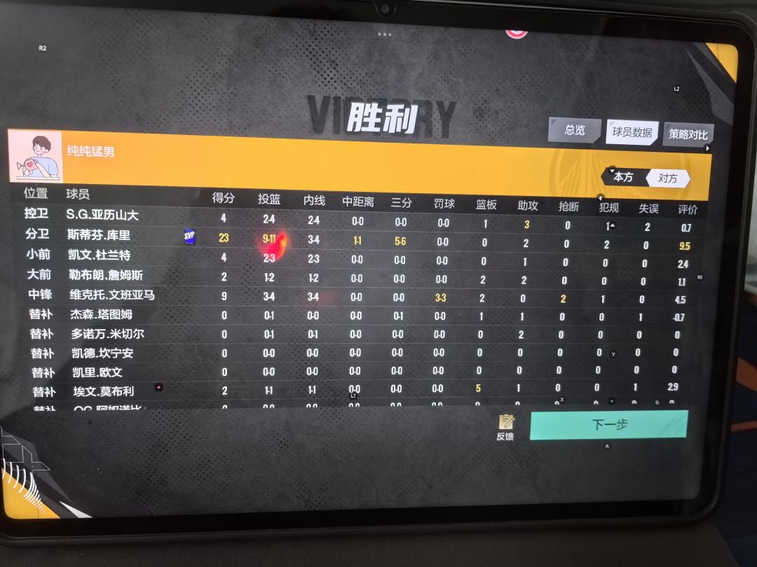 与上一期三外二内阵容不同的是,这一期我变换了阵容,来到四外一内,并不是三外二内不行,而是因为现在的内线球员并不叫二内球员,只能说是板c,没有中投,所以在上了前20后和他们交手倍感吃力,我换成了四外一内的打法,战术主打quick 4 horns flare。 遇到这种氪佬,不要慌,我认为这个游戏第一节和第二节是以试探为主,试探对方打法,这场比赛,我试探出对方主攻手是满突库里,目前最准的射手,所以我的