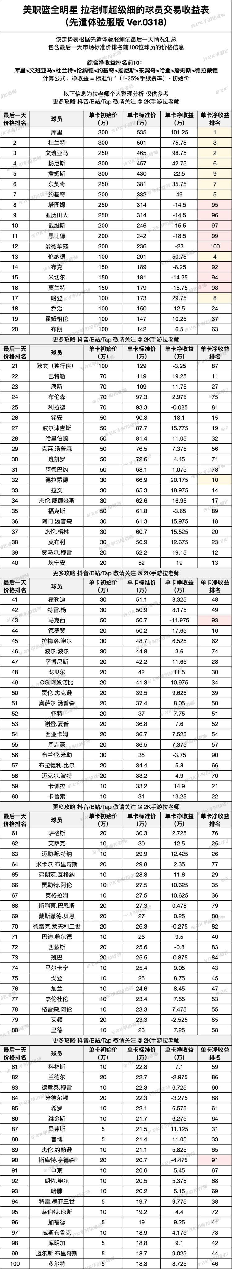为期15天的先遣体验服在今天下午2点正式结束了 3.25号也将迎来游戏的正式开放 这期简单给大家做个球员单卡价格变动复盘 包含交易所标准价排名前100的球员 当然3.25的球员数据将会迎来更大的更新 所以图表内容仅供参考 截止先遣体验服关服前 交易市场标准价排名前10的分别是 库里 535w 杜兰特 501w 文班亚马 465w 扬尼斯 457w 詹姆斯 430w 东契奇 381w 约基奇 332