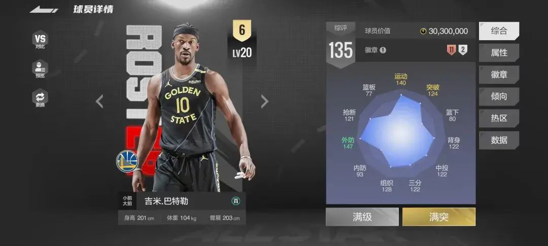 1.巴特勒街头强度测评 首先来看数值,巴特勒基本是一个均衡的万能2号位战士,甚至能客串下组织1号位。有冲框,有传球,有防守,也可以蒙三分,数值上了120在热区能蒙1-2个的。突破上篮138,但根据实测,内线有中锋基本很难上进,必须把中锋给调出来才能进去。 传球属于顶级水平,自己经常在实战中利用假投真传来吸引对面防守,从而帮助队友得分。内防和外防都属于顶级,速度131,敏捷150,弹跳126,体力1