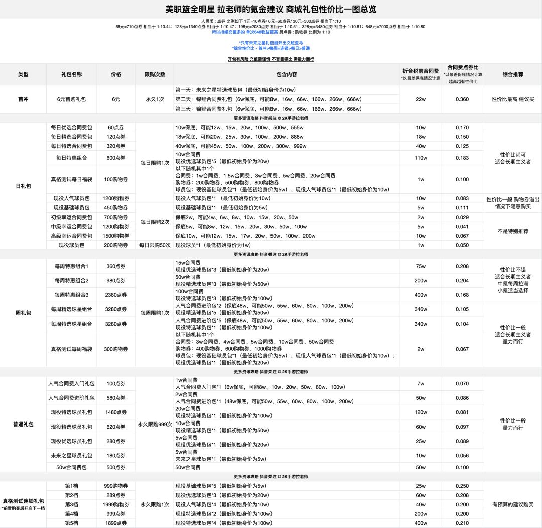 今天给大家带来一期究极购物券使用攻略 本次分析基于最新3.22号的公式几率和先遣体验服数据 所以仅供参考 具体请以正式开服为准 先上结论 按照1:100的比例换算成每元合同费 排名如下 每日福袋>每周福袋>高级幸运合同费包>现役基础球员包>现役人气球员包>现役球员包>中级幸运合同费包>初级幸运合同费包 同样 初期合同费包有点优势 随着后面球员涨价 建议只买球员包 #nba2k手游 #美职篮全明星