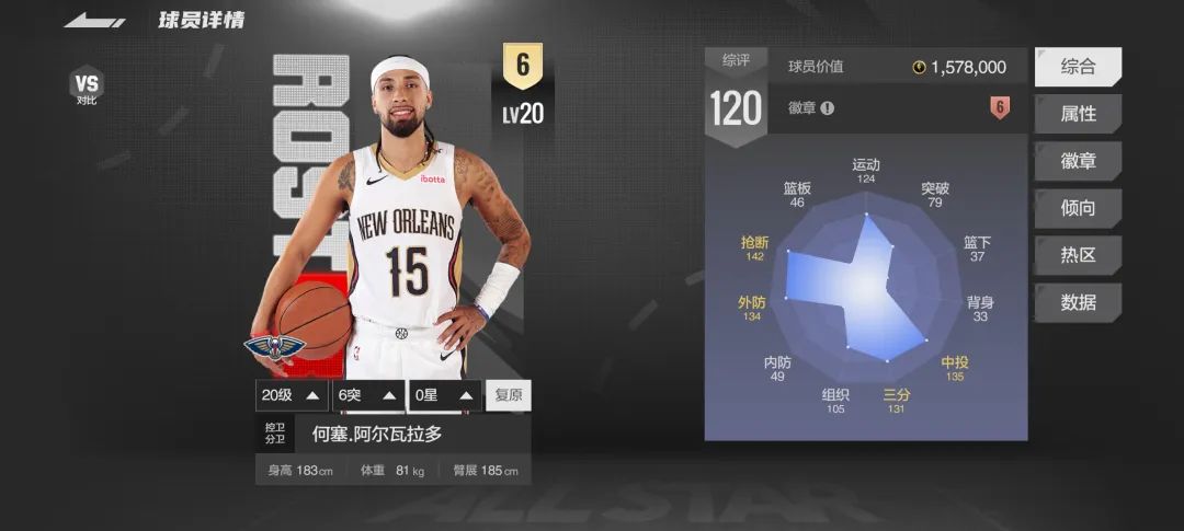 1.阿尔瓦拉多-低突欧文的噩梦 目前单卡5万即可买到一个不错的平民街头1号位,缺点也有,模型小,内防低而且运球速度稍微有点慢,但恐怖的外防,抢断和不错的三分还是有强度的。三分131过线了还不错,至少是空位能中的,外防133+抢断152,保证了外线的防守。 防守全套徽章都有,也给了死缠和持球抢断,基本能保证锁住对方的1号位。 另外加上不错的热区配置,这张卡就是专门给大部分低突欧文玩家准备的,目前来看