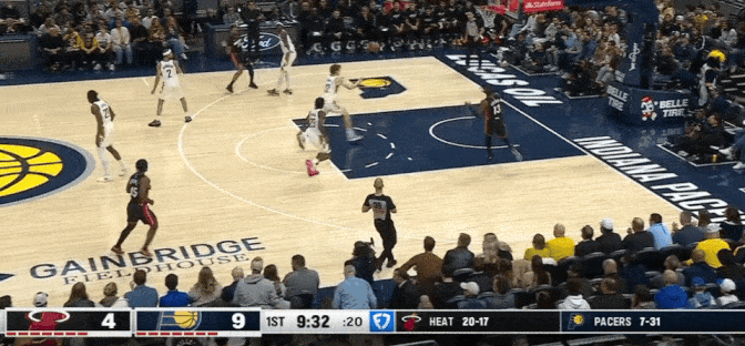NBA常规赛,步行者主场迎战热火的比赛正在进行中。【阿德巴约残暴隔扣弗菲2+1】举火烧天!阿德巴约篮下接球,举火烧天无视弗菲残暴隔扣2+1打进!