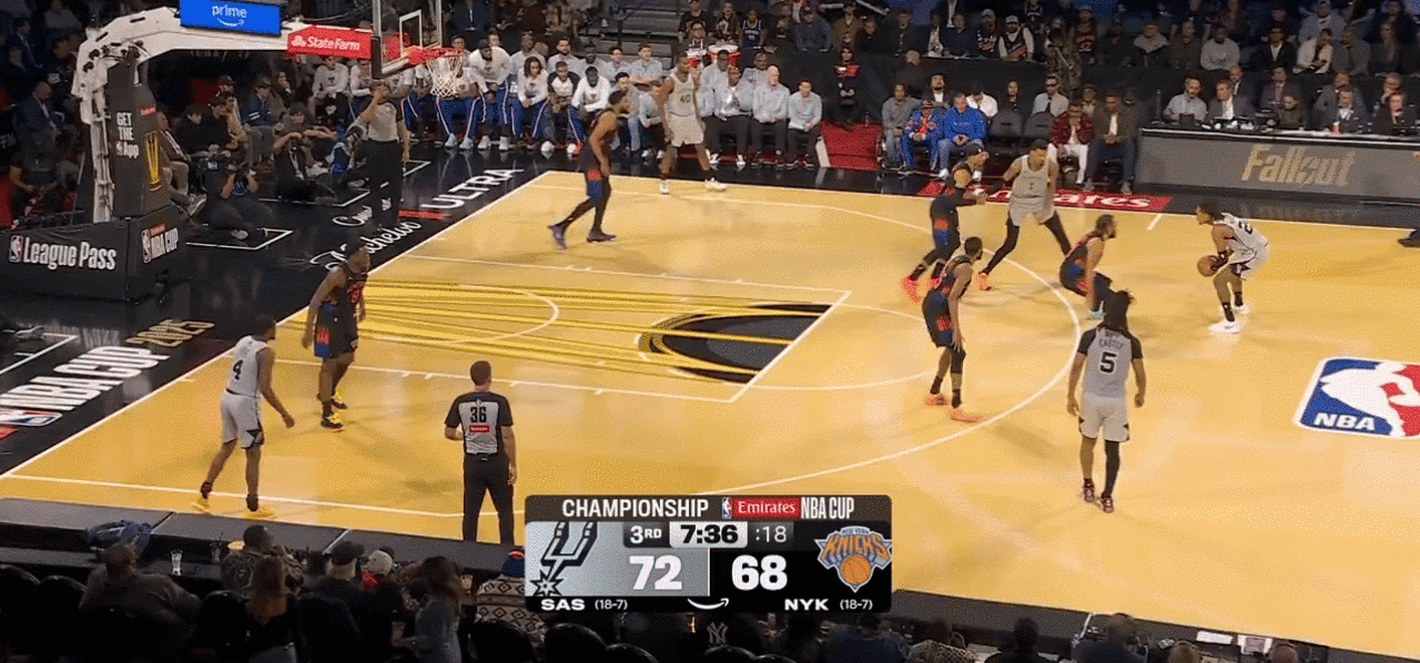NBA杯决赛,尼克斯对阵马刺的比赛正在进行中。第三节比赛结束,马刺94-89领先尼克斯。第三节比赛中,瓦塞尔持球丝滑转身跳传送空接,文班亚马头都没回直接仰头背扣将球稳稳打进!