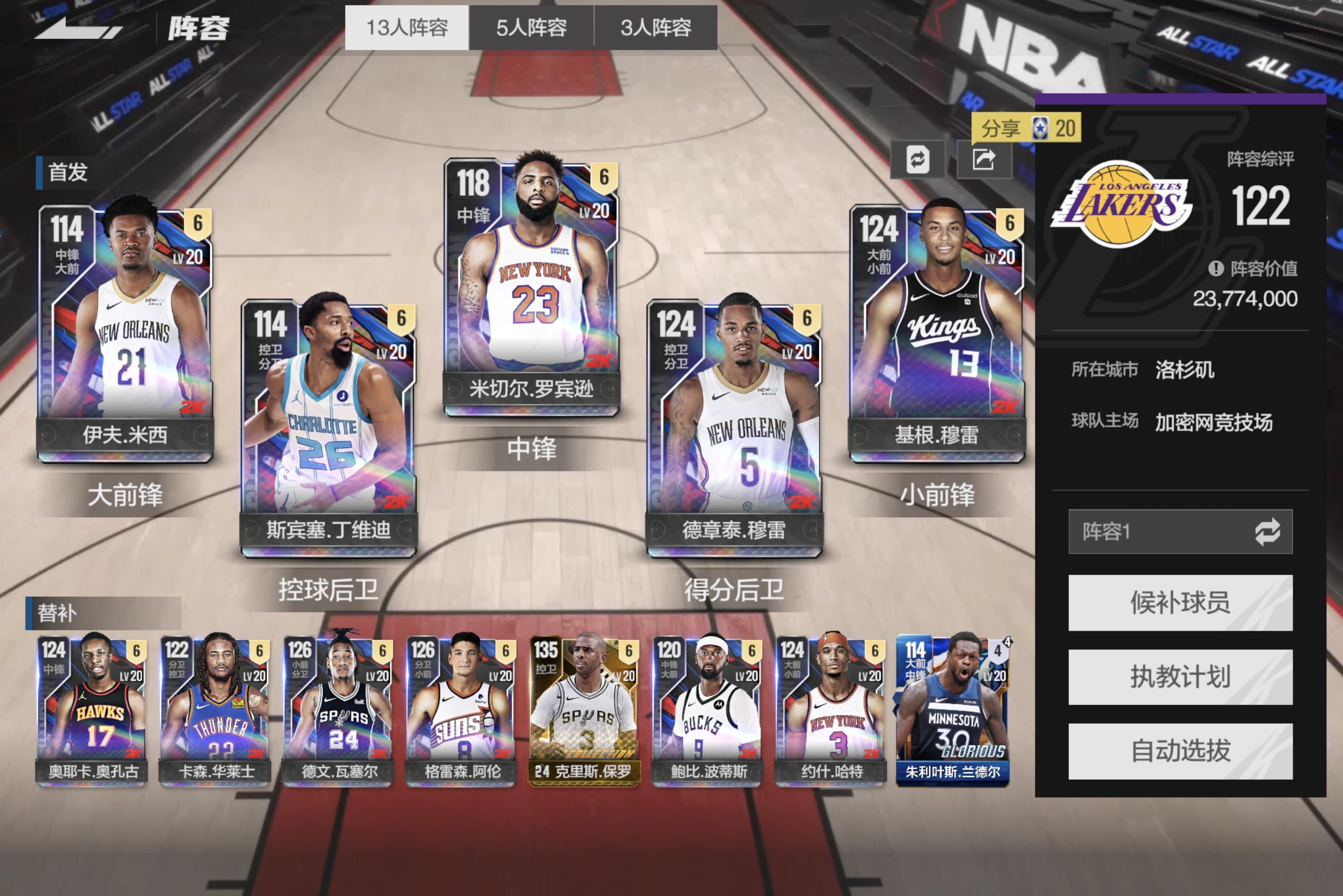 #2k手游球星牌 我选的常规指导约契奇,然后是布伦森,阿泰斯特,斯玛特,巴图姆,哈登,奥多姆,主打一个对子,然后哈登是明星牌多一个就震撼加倍,然后打对子顺子来过关。这个模式还是蛮好玩的。 #美职篮全明星