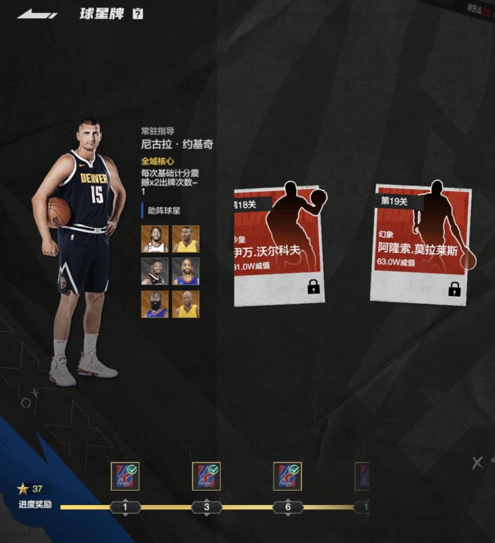 #2k手游球星牌 我选的常规指导约契奇,然后是布伦森,阿泰斯特,斯玛特,巴图姆,哈登,奥多姆,主打一个对子,然后哈登是明星牌多一个就震撼加倍,然后打对子顺子来过关。这个模式还是蛮好玩的。 #美职篮全明星