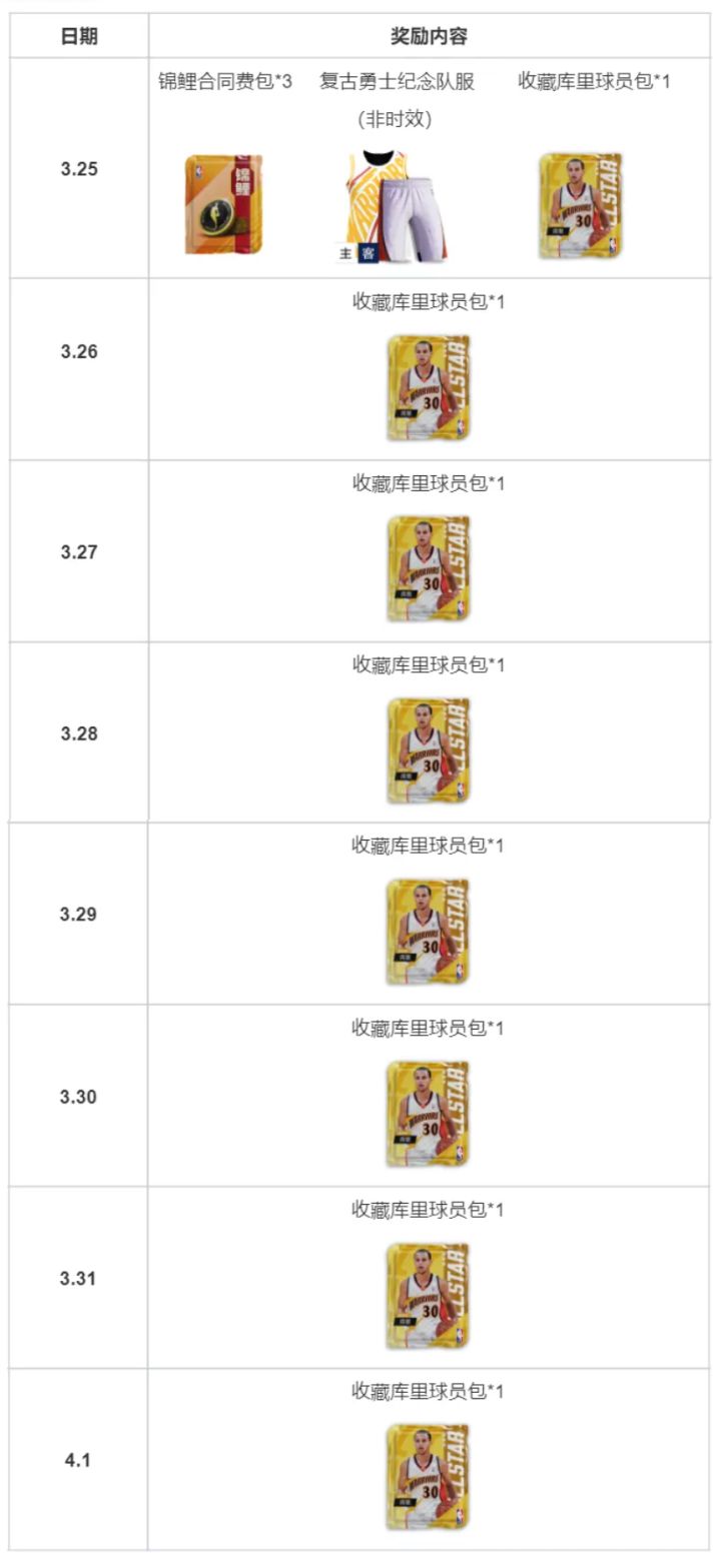 周年庆活动火热进行中!老K温馨提醒,千万不要错过每日领好礼的机会!3.25~4.1,每日登录游戏,即可获得锦鲤合同费包、复古勇士纪念队服及总计8个收藏库里球员包奖励!
