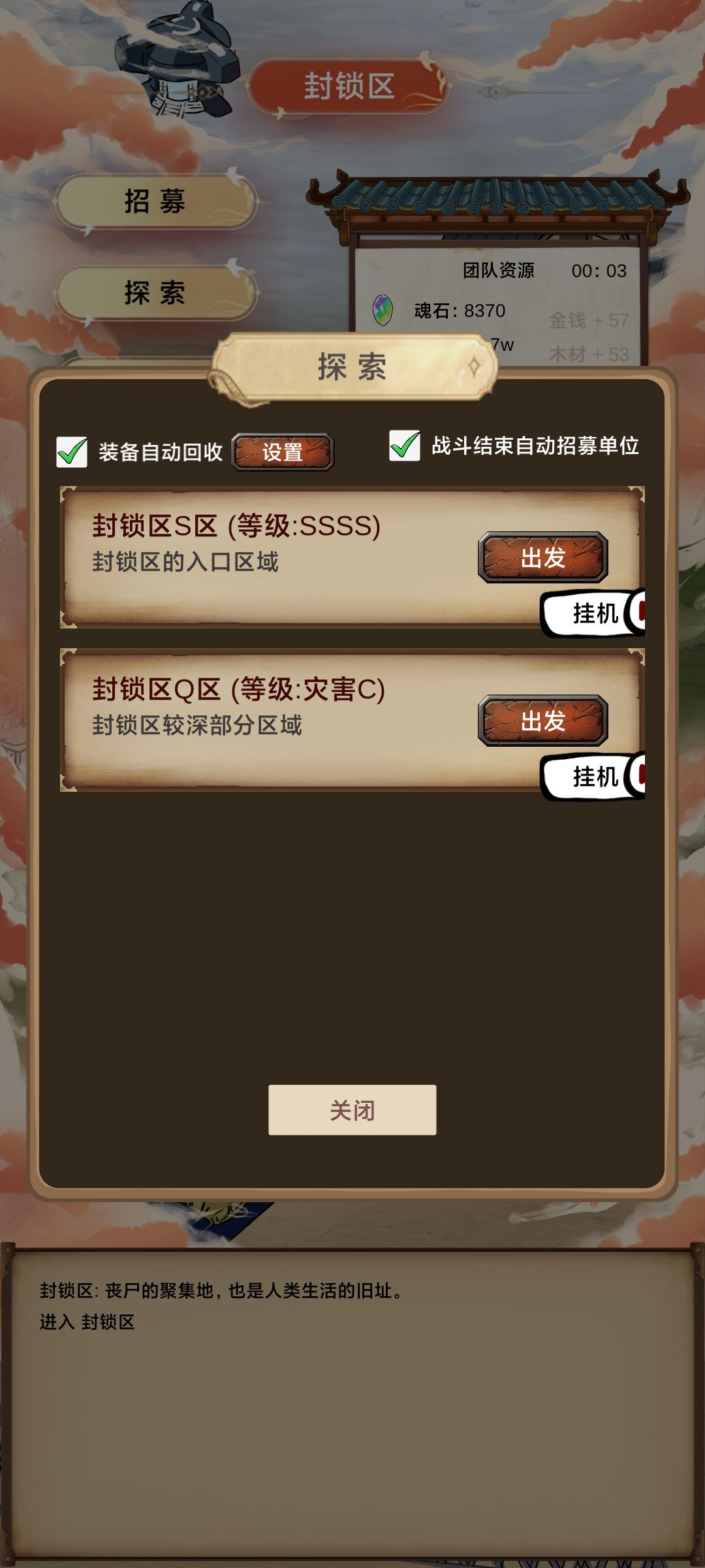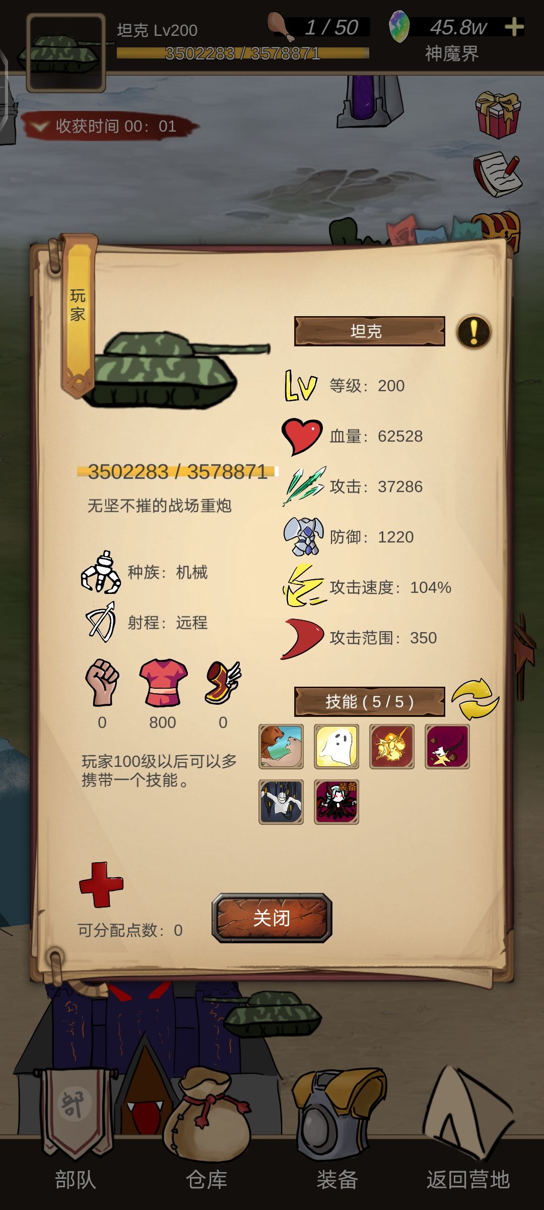 首先建议买个免广告,广告很多很烦,省事不少, 前期地图有概率翻车,需要盯一下,挂机前勾选自动招募,按需求设置装备自动回收,另外本游戏需大量时间挂机,不喜忽入 开局有免广告可以刷个改造,战士血统,狂暴打击,手术刀这些技能,加点5力,没开免广告就随便了,无所谓,后面都能学 第一阶段目标:学会舍命冲锋,毁灭打击,胡乱投掷,部队成型,勇者+8科学狂人+3牧师+1指挥官,耗时约7小时,勇者23级。 进游戏先
