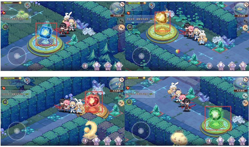 #梦的第七章 红心城堡探索: (1)【击败未知来者】重复任务,队长大人需要先在月光庭院中收集到以下四个宝石,位置在主图。收集完宝石后移到中心位置对四个宝石柱依次镶嵌宝石,探索主线boss就出来了,击败完成任务 (2)【吃掉所有正常的苹果】唯一任务,完成后不再出现。 在探索过程中会概率出现且坐标随机刷新四种苹果,全部吃掉后就可以完成探索任务。四种苹果按颜色分别为,青色、橙色、红色、深红色。 需要注意