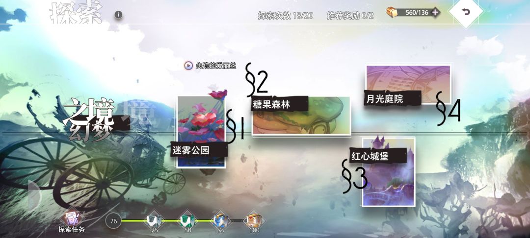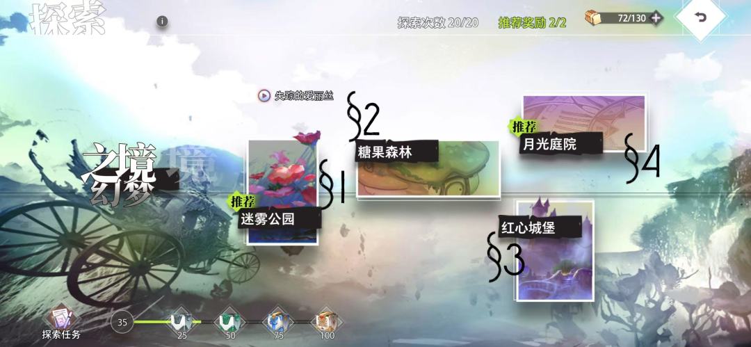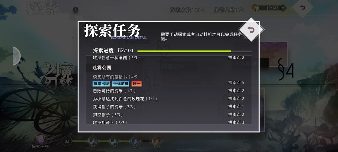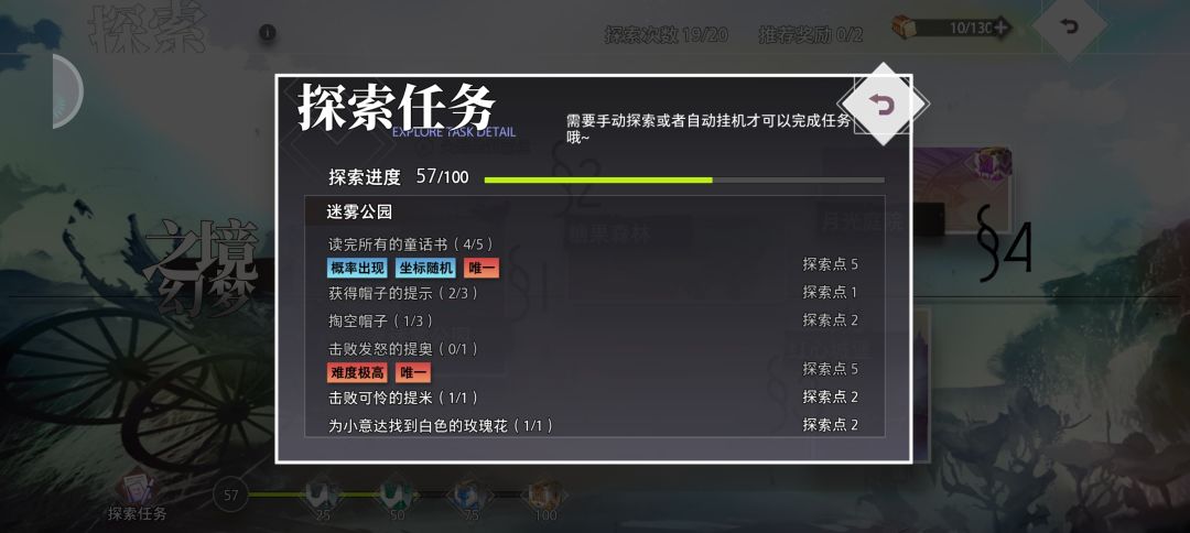 (1)迷雾公园 (1)读完所有童话书:概率出现和只能完成一次的任务,这个任务需要运气,童话书因为坐标是随机的,所以在探索中需要仔细观察地面看看有没有书,出现了过去对话就可以了。已经对话过的童话书是不会再出现的了。 (2)击败可怜的提米:这个容易完成,毕竟是关底boss。只需要在探索的最后和爱丽丝对话,可怜的提米就会出现,击败就可以完成了。 (3)为小意达找到白色玫瑰花:这个是重复任务,每次探索都会