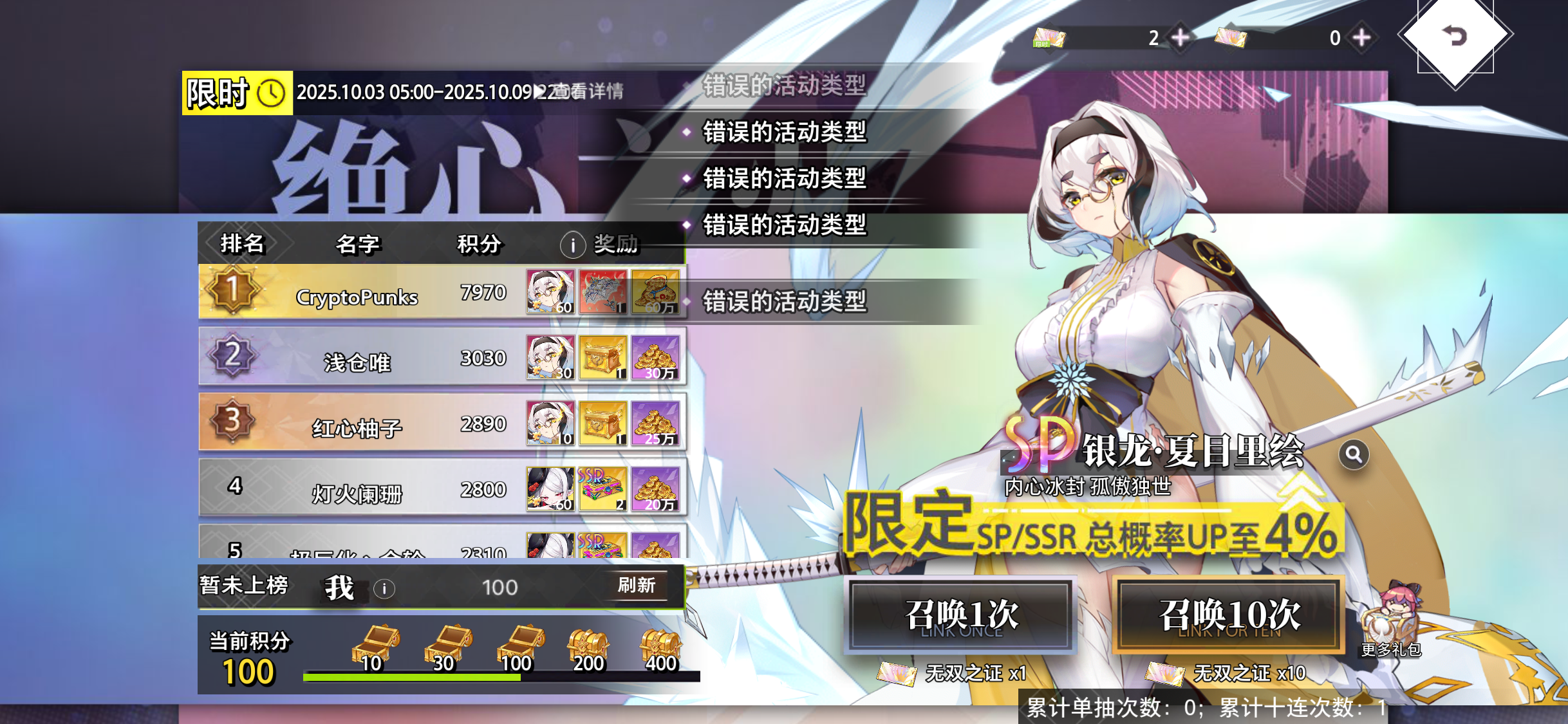 预计12月关服不建议氪金,要氪也等明年1月再说 10月10日 JJC守门,精准池琳达必抽一个。UR装备池归蝶和格兰特专武2个都有用建议抽一个保底 10月11日 JJC结算,协同,拉拉队万福不氪白嫖2个能用 未来预测 艾恩 其他链接 【世界boss】「月夜异动」, https://www.taptap.cn/moment/706197654727560409 时魄攻略 https://www.tap