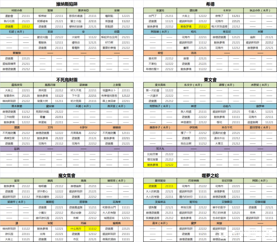 每日约会攻略 ●瑟琳娜- 自我介绍+51分=12112 自我介绍+42分=11112 自我介绍+42分=22112 ●茉莉- 欢迎光临维纳斯陷阱+42分=12112 欢迎光临维纳斯陷阱 +51分=22112 ●神澄- 不擅长与人相处+60分=21111 游乐园+60分=22222 神澄迟到+60分=22122 ●小夜- 运动会+60分=21111 执行任务总是遇到一些怪