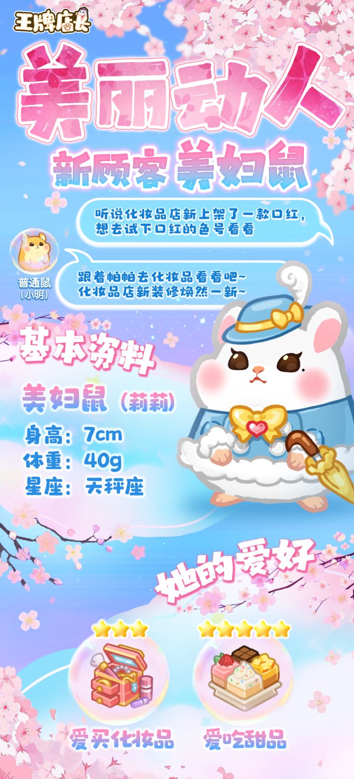 【参与方式】预约游戏+转发美妇鼠海报至Tap社区、B站、微博、小红书等任一社交平台并带上#王牌店长 标签,将预约截图、转发内容截图回复至本帖下方评论区即为参与成功~【活动奖励】小仓仓将随机在评论区抽取2名店长送出《王牌店长》限定周边抱枕*1(美妇鼠版)【活动时间】即日起-3月13日【活动规则】1. 同一ID不可多次回复,多次回复只算一次2. 留言不符合要求,将取消并顺延至下一有效楼