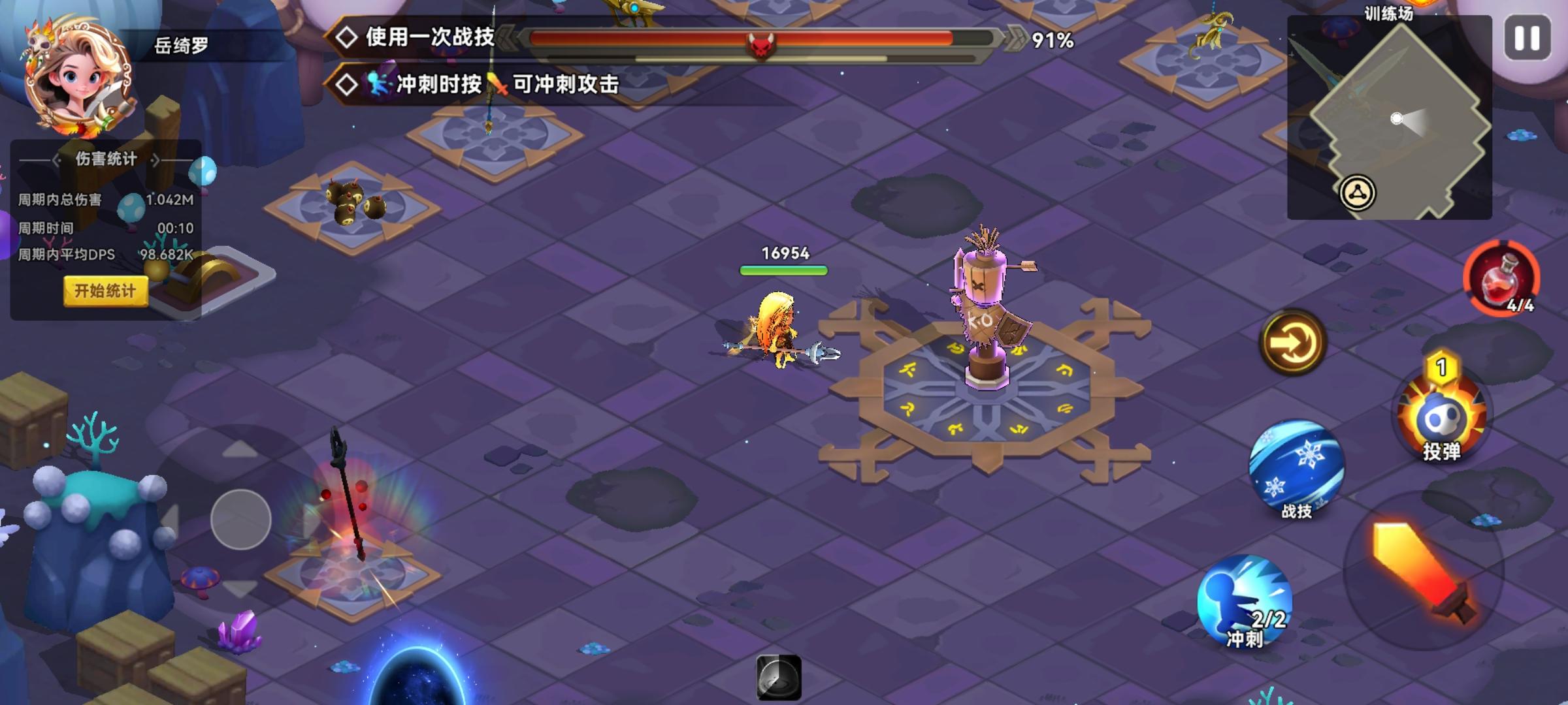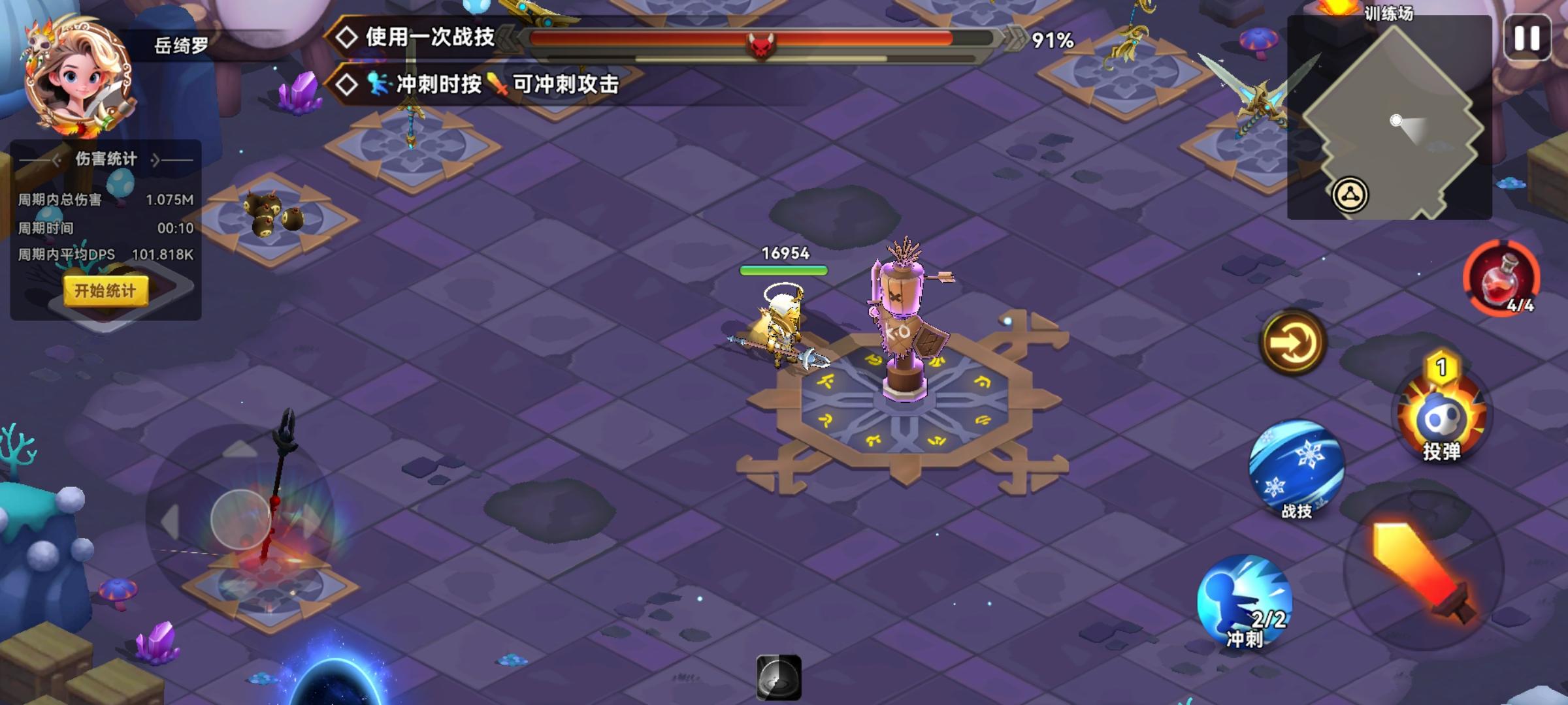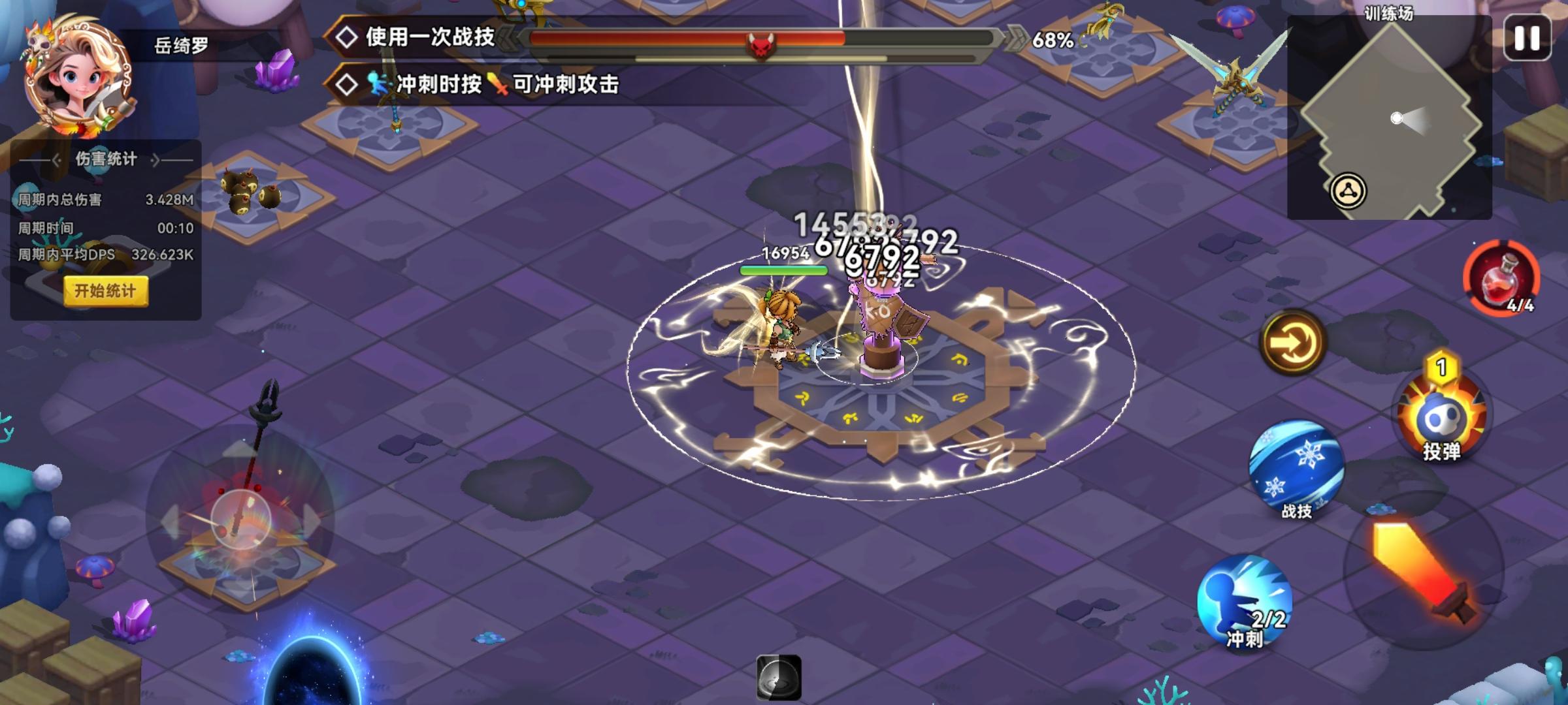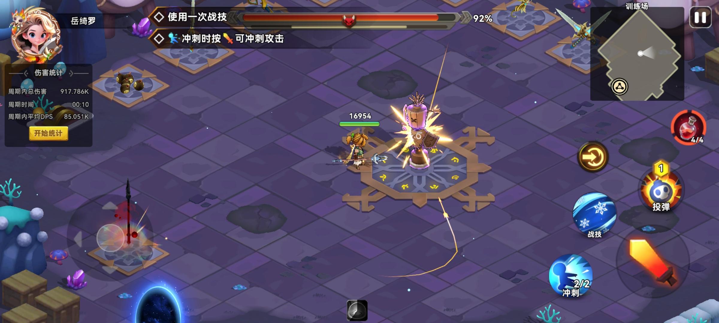 开局需重点关注体力系统:每次挑战关卡固定消耗5点体力,每日体力上限有限,建议优先完成可稳定获取体力恢复道具的任务。进入战斗后,界面左侧为方向轮盘,用于控制角色移动;右侧依次为普通攻击键、冲刺键、技能释放键——其中第三按键为通用型炸弹键,具备范围伤害(AOE)效果;右下角设有血瓶图标,长按可使用回血,但生命值满时无法触发该操作。角色初始即绑定“守护神”系统,该机制类似神格加成,在通关或击败首领后可