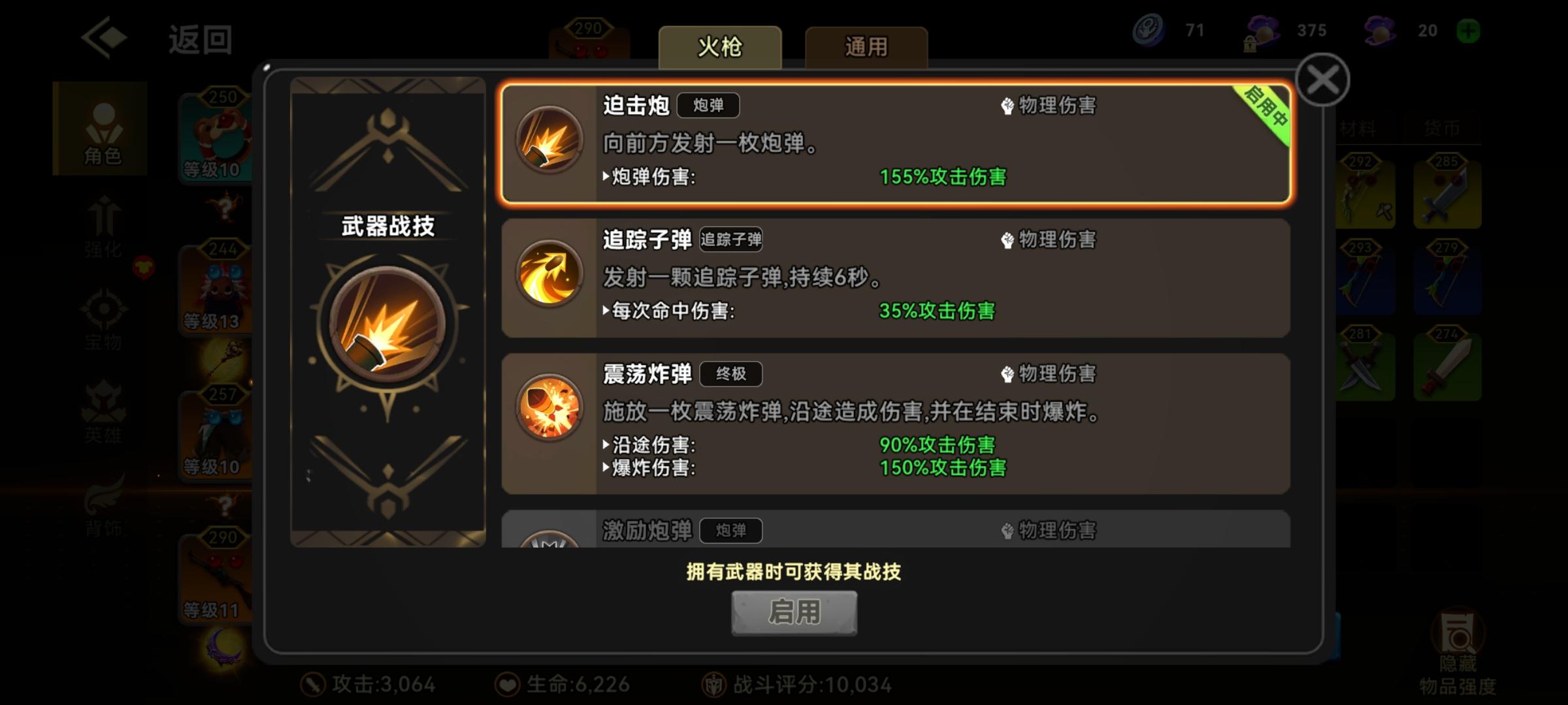 生命6226攻击3064武器枪,战技一定要选择迫击炮几个关键技 守护:守护投掷(战技会眩晕) 猎神:利刃攻击,狩猎标志(攻击产生爆炸) 太阳:点燃,高温压镜(提升普通攻击伤害)最关键的技能:1.大力的将战技分为5个,但伤害变低2.提升普通攻击速度,有必拿,散弹枪可选可不选,得配合攻击速度原理:尽量选群伤,度过前期,后期的boss也能用得上,会有个加血,这样也好清后期伤害通过普通攻