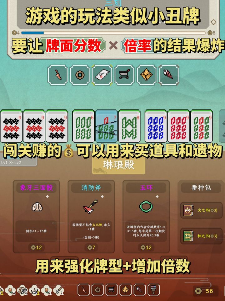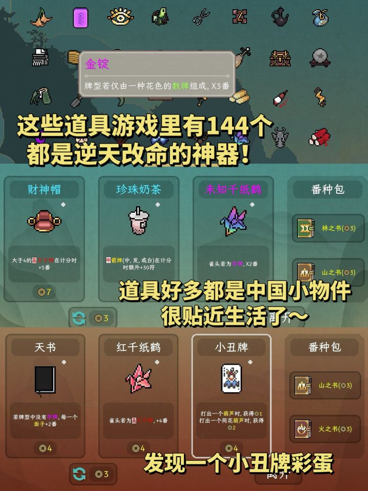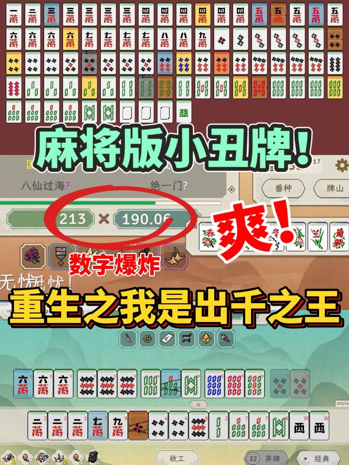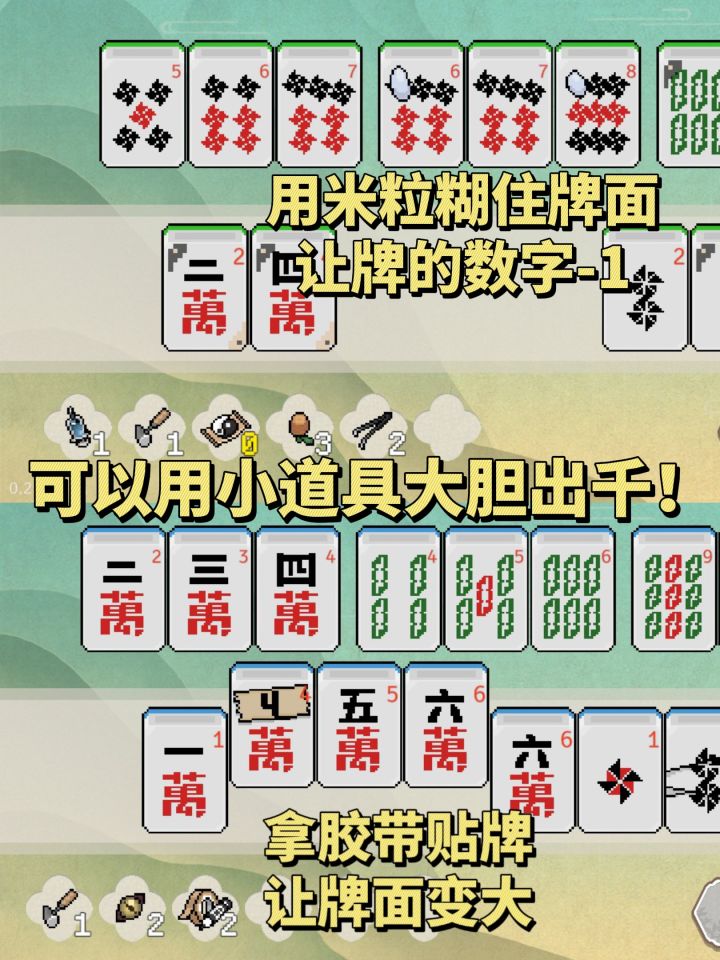 看我发现了什么?更适合中国宝宝体质的麻将版小丑牌! 这也太适合春节放假时玩了,我这一手麻将不得迷死七大姑八大姨! 游戏虽然是小丑牌like的玩法,但也融合日麻川麻国标的玩法,番种特别多。 还有上百种道具可以让你出千: 用锤子砸碎不想要的牌,拿米粒糊上牌面缩小数字,用贴纸偷偷修改牌面等等……各种精简牌组,逆天改命,最后胡出大牌,数字爆炸时特别有成就感,一把千万不是梦! 游戏