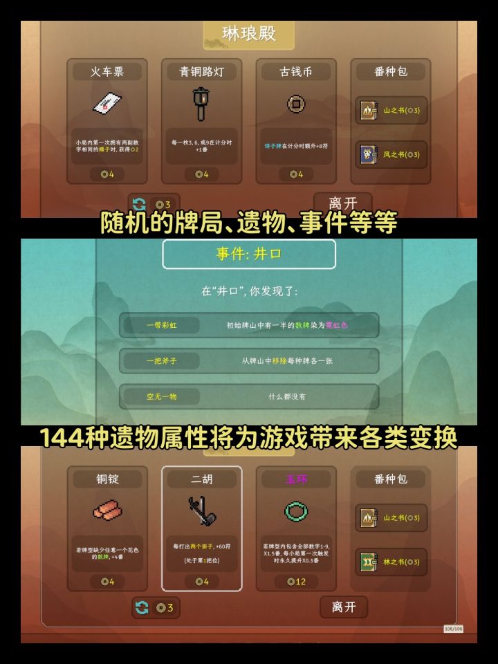 🎮名字:青天井✅平台:steam(1月20上午11:00,首发39.6)|TapTap(预约中)🏷标签:策略、麻将、肉鸽、模拟------👉这是一款以麻将为主题的卡牌肉鸽游戏,使用结合各地麻将规则打造出自己的牌组,一路上披荆斩棘抵达井底揭开蒙尘的真相。-🌻【游戏内容】✨100+种役种、144种遗物,每幅牌都能激发出不同的效果✨随机生成的关卡、遗物、道具和增幅,让你每次都有不同体验✨