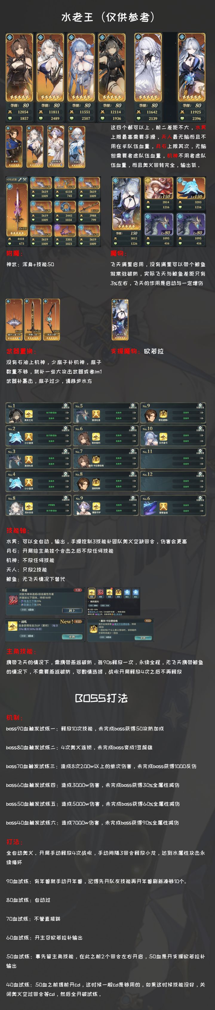 如题,看图免责声明,仅供参考,非专业数据老,一切仅在前两次会战与挖矿boss与木桩打桩测试得来。一:上述阵容构成中,佐娅和露切为不可替代,只有二号位是摇摆位,伤害高低依次是水男>月石>天人>机神,其中水男月石有一定生存压力,道中需要手动开启几次佐娅1技能回复血量,天人与机神无脑,全程等奥义跳过即可。二:记得手动卡双龙cd,开局间隔3回合手动使用水龙达到永续三:飞天与鲸鱼实际差异不到3%四