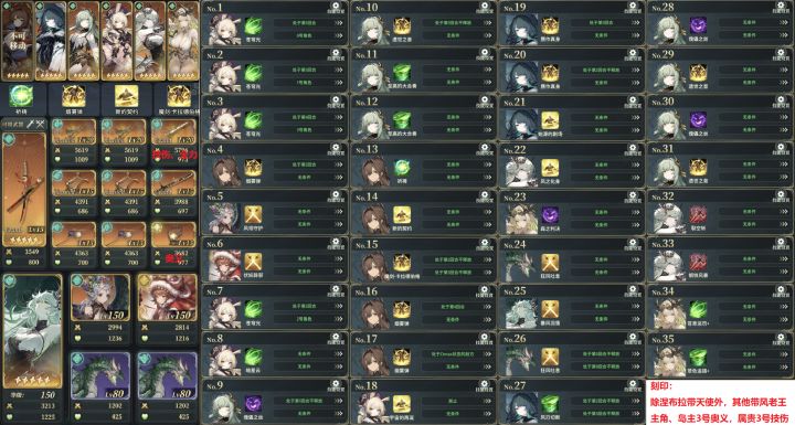 群车10连车,5王1躺只有1把意外翻车交了1个复活。角色配置-如图所示:前排-主角职业魔剑大师(祈祷、烟雾弹、魔剑·卡拉德伯格),1号位奥菲莉娅(风岛主)、2号位和音傀(风属贵)、3号位涅布拉(风季限)后排-斯文托维特(风老王)、弗洛拉备注:务必把涅布拉放在第四位,如果放在1号位会因为涅布拉一直消耗刻印层数,奥义获取跟不上导致断奥义降低回转。武器配置-如图所示:主手石油刀,2lm2,2