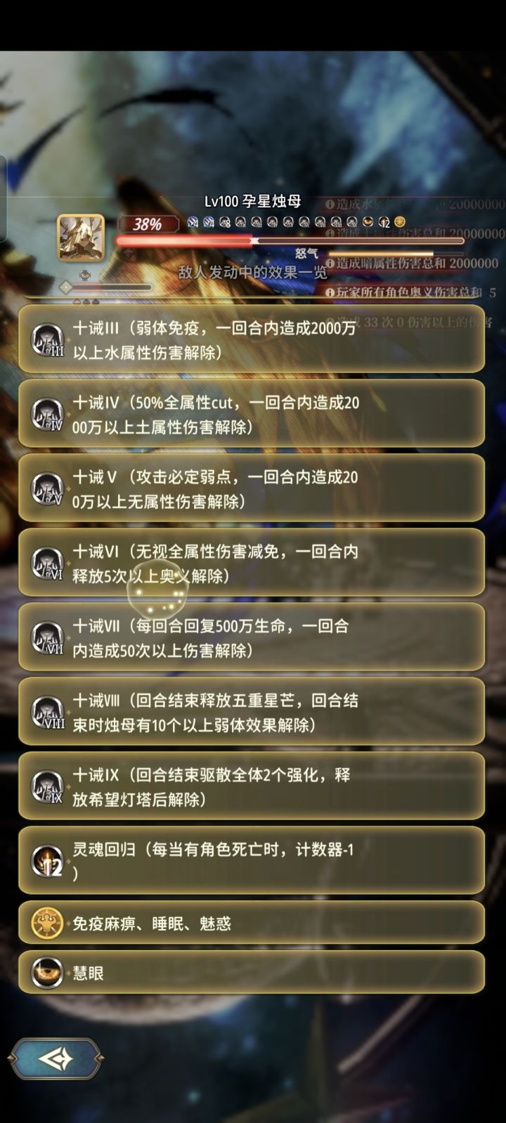涅一技能不可驱散buff一样被驱散一回合造成50次伤害,只计算技能伤害,奥义普攻不计算,轻松超过50段伤害未解除一回合释放5次奥义解除,魔剑主2奥义加队友3奥义满足条件未解除释放希望灯塔解除试炼,释放两次希望灯塔未解除右上角都解除了点开详情又没解除,那到底解没解除?烛母释放五重星芒,五重星芒效果是什么?