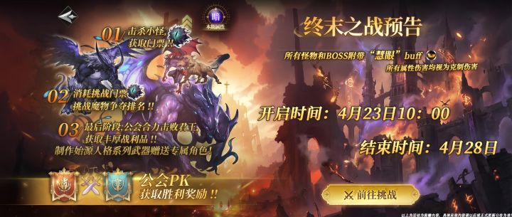 亲爱的冒险家们ヽ ( ̄ω ̄(。。) ゝ万众期待的终末之战复刻,即将重磅开启!活动时间:4月23日10:00-4月28日活动奖励:珍稀道具、限定称号、排名奖励等你获取(๑•̀ㅂ•́)و✧请各位冒险家提前做好准备,冲击更高排名,赢取丰厚奖励!悄悄剧透一下,本期属性为「暗」属性哦~(所有怪物和BOSS附带“慧眼”buff:所有属性伤害均视为克制伤害)⚠️ 以上为活动前瞻内容,具体规则与奖励请