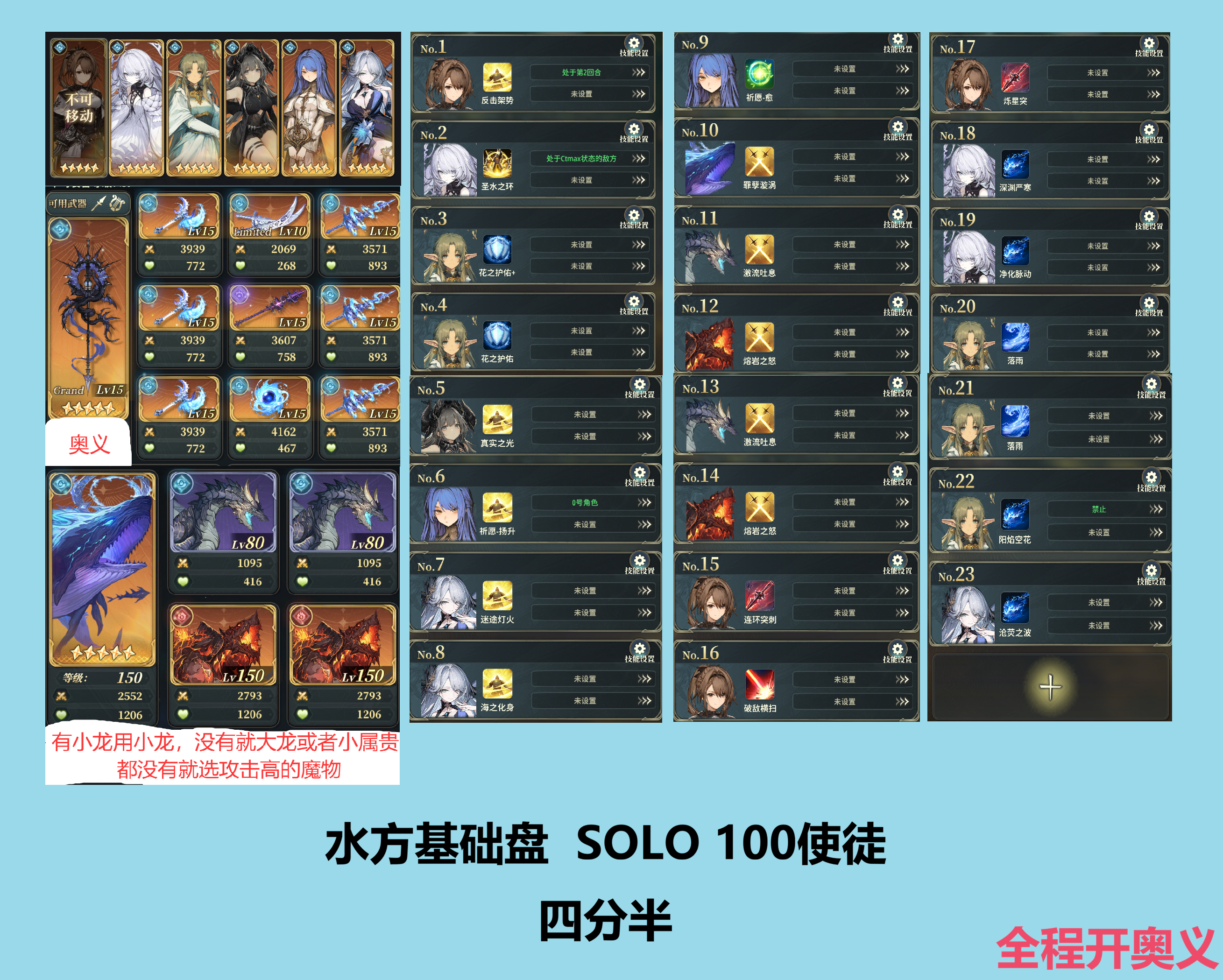 1月21号更新:更新了露彻队,实测其伤害更高,破土buff之后回合均伤能到1500w以上。更新了技能轴。自动水的核心原理:艾丽娅2技能将受到伤害转为火伤,并提供50%的火伤减免。奈法3刷新艾莉娅2,实现每波满豆都能刷一个艾丽娅2来接。水龙冷却6回合,持续3回合,双水龙无缝覆盖提供30%的水属伤和火伤减免,与艾丽娅2加算达到80%的伤害减免,从而具备极强的生存能力。由此,我们可以明确,不可替换的