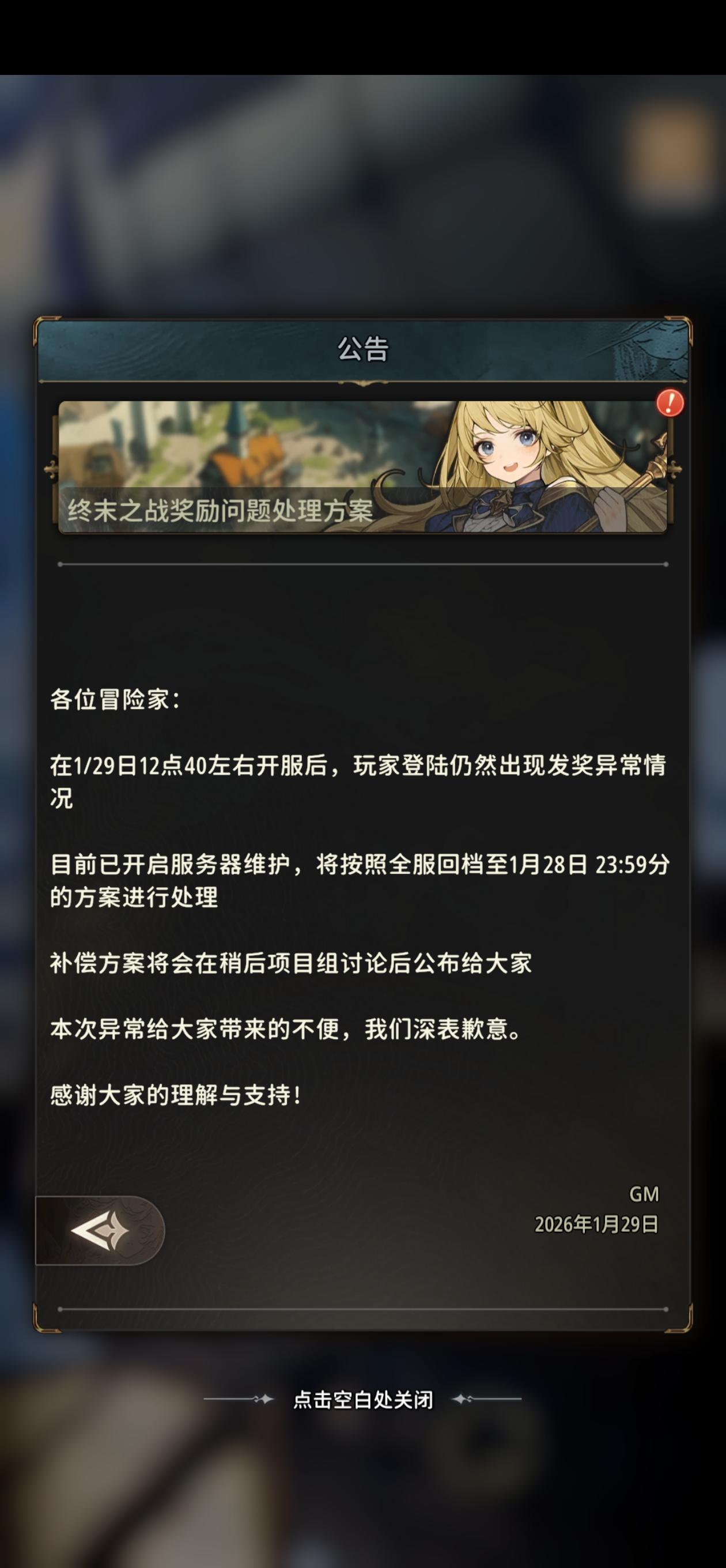 各位冒险家:针对1 月 29 日 00:00 出现的终末之战奖励发放异常问题,处理方案说明:一、事情经过:官方发现奖励发放异常后,在约00:05进行了紧急停服处理;同时开始评估事件的影响,最终确定852名玩家进行了奖励领取,其中294名玩家对奖励进行了使用二、处理方案:综合评估方案有两个方案1、对所有发放奖励进行回收,对294名奖励使用的玩家,进行奖励追缴(所有兑换奖励进行扣除,不足