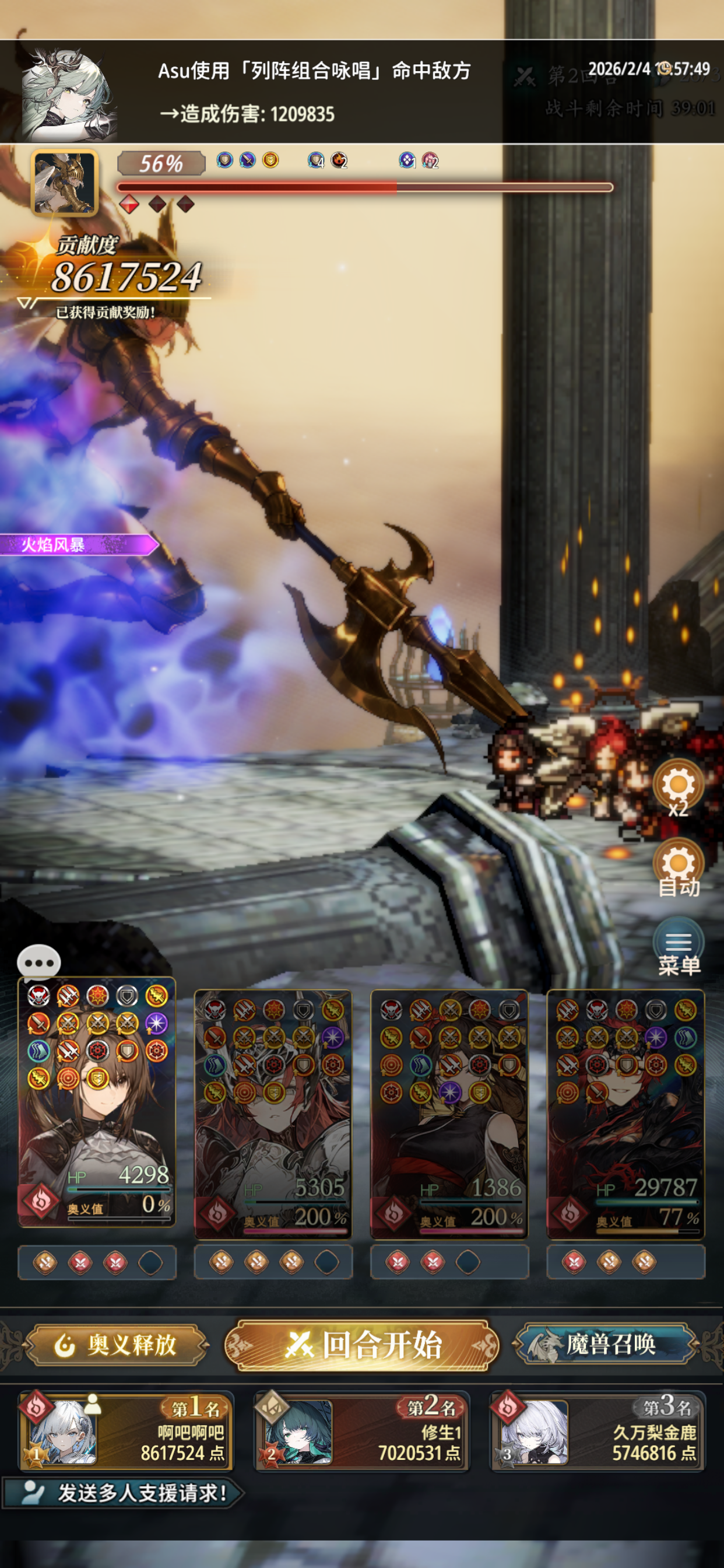 不会出现没伤害的情况第一t 主角4+花 快速出伤390w拿贡献箱第二t 渡 +花 大概伤害860w左右追一追M箱想要更快就把渡的技能去了,不管怎么说伤害都比带菠萝高.多1键 改个角色 比上个配法高200w贡献