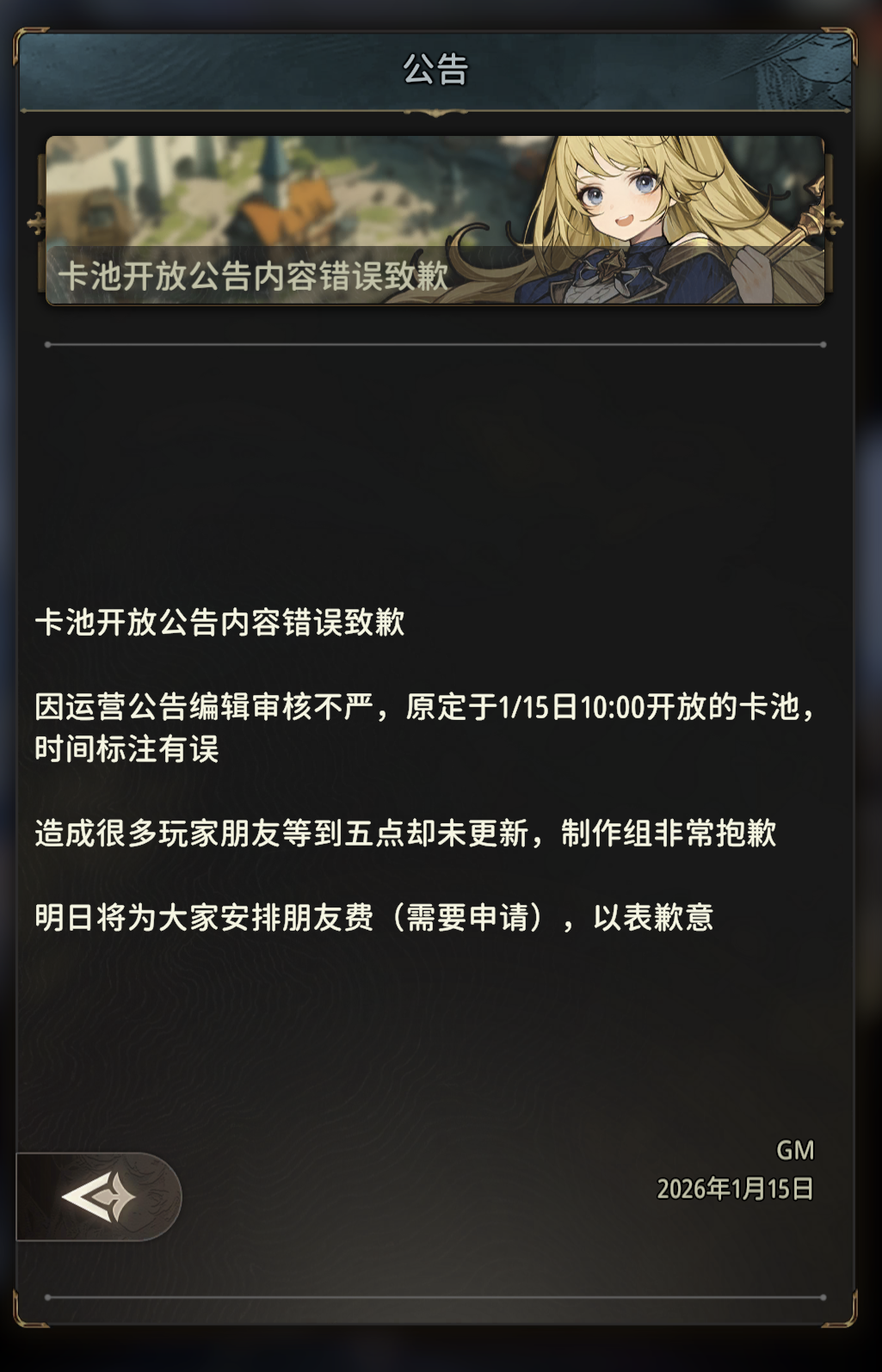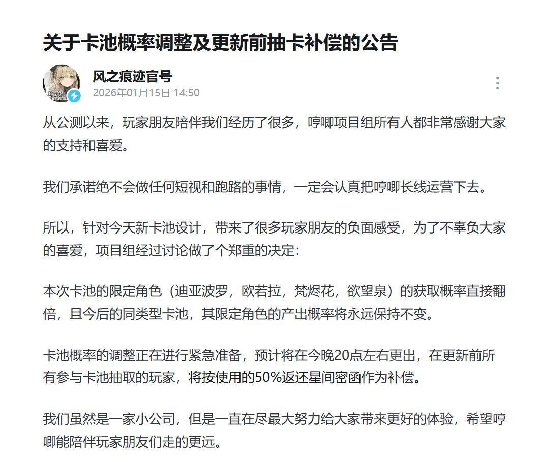 《风之痕迹》紧急调整卡池概率,抽卡玩家得高额返还由成都六分鱼网络科技有限公司开发的像素冒险RPG游戏《风之痕迹》近日再次引发玩家热议,原因系游戏糟糕至极的抽卡体验!(新角色加入卡池却不up)面对玩家们的愤怒,官方于今日发布公告,回应新卡池引发的玩家反馈。项目组表示将长期运营,不会短视行事,并对此次设计带来的负面体验致歉。在内容中,官方决定,将当前限定角色卡池中四位角色的获取概率直接翻倍,且今