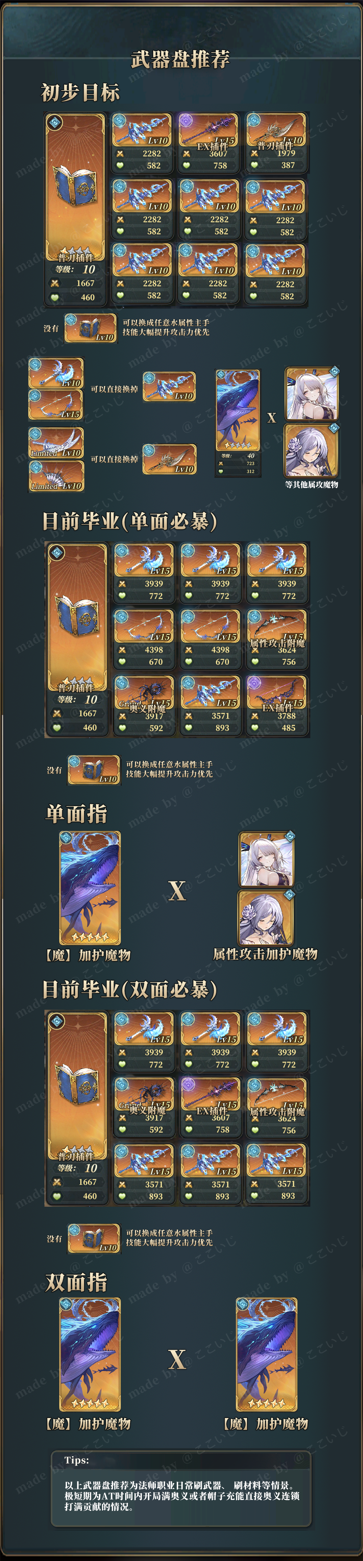 双面借鲸鱼,土老王刚需,两条水飞龙刚需,主手不需要满破水小龙循环丢,无限覆盖,丢土老王的回合除外,其余召唤随缘丢开局-试炼全解先驱散,最好是等回响变1再动,2层有概率打死人主全按,奈法攒三层给缪斯刷奥义速叠刻印,然后准备刷水岛主技能;水岛开3,t3开2(覆盖第一次满豆技);缪斯开13,t2给第一回合被打的队友挂2防止连打同一个减员第二次满豆之前应解除水试炼,若其余试炼未解除可以酌情等待试