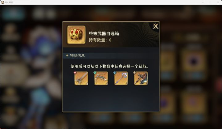 找了一圈,没看到天人的制作攻略,然后自己也踩坑了,所以写一篇攻略想让萌新别也踩坑。首先我们要知道啥是天人,天人是游戏中的角色,正常途径下是通过古战场相关活动,目前的桃符活动商店也可以获取一个6星的天人武器(武器至少保留一个,有些攻略的武器盘子需要),可以直接获得上限等级为80的天人一个。古战场是刷终末武器自选箱(图二),获取对应天人的武器,然后通过武器一步一步将天人制作出来。目前游戏中一共有四