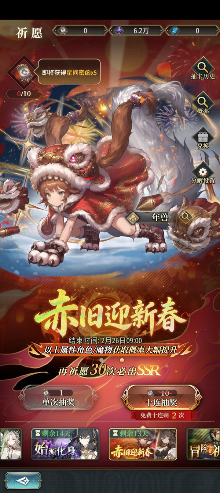 今天的免费100抽捞到了三个lm和年兽虽然没有赤兔但我可以拿自选换,昨天中10抽+活动送的10票自费160抽一井无UP但有两个lm+水老王也算不那么亏,要是昨天不自费的话那自费10抽就能抽一井一了,还是急了,目前还有90抽能再井,后面保底送50抽,还有送的10票没用,也就是说这次自费190抽能拿3个UP,希望后面能中个几次二三十抽的让我自费160抽拿三个UP