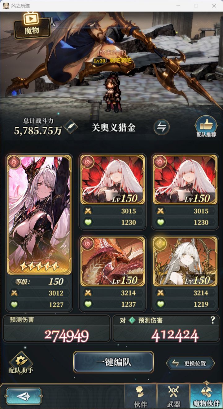 本图制作于天人版本春节前适用于刷取 始源魔兽——噩梦,以获取135附魔武器❶如果挂机的时候车速过快导致奥义放不出来,所有的队伍都只设置1个技能,就是法师主角的4技能——列阵组合咏唱。达成1T1键,基本上都能达标。可视伤害情况在法师4技能后设置——主召魔物技能,达成1+1,释放速度比传统2键快一点点。❷后排的老王角色如果没有,可以使用对应属性的机神代替阵容灵活多变,非最优解,可根据自