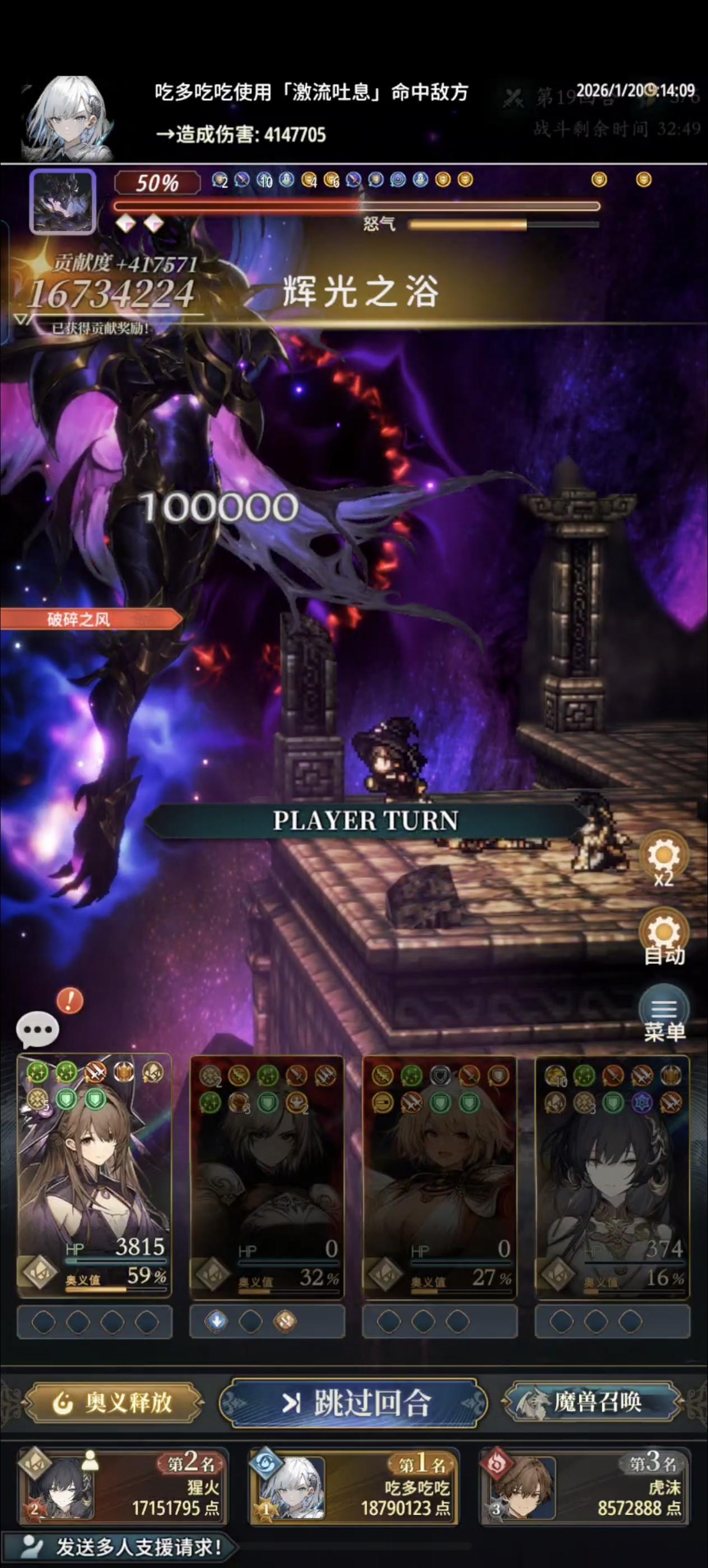 1月20号更新:技能轴魔物bug已修复,图里技能轴前4项魔物配置请勿再照抄,现在直接按水龙-鲸鱼-风鸟/鲸鱼-水龙来设置技能轴即可。技能轴其他部分不变,目标选择bug仍未修复。一套是特莉同奥义队,一套是欧若拉反击队,两套伤害基本一致,在解完土buff的情况下回合均伤都在1000w以上。特莉同刷奥义值快容错更高,欧若拉适合没做水机神的玩家。图一是特莉同队的伤害,图二是欧若拉队的伤害,特莉同那把土