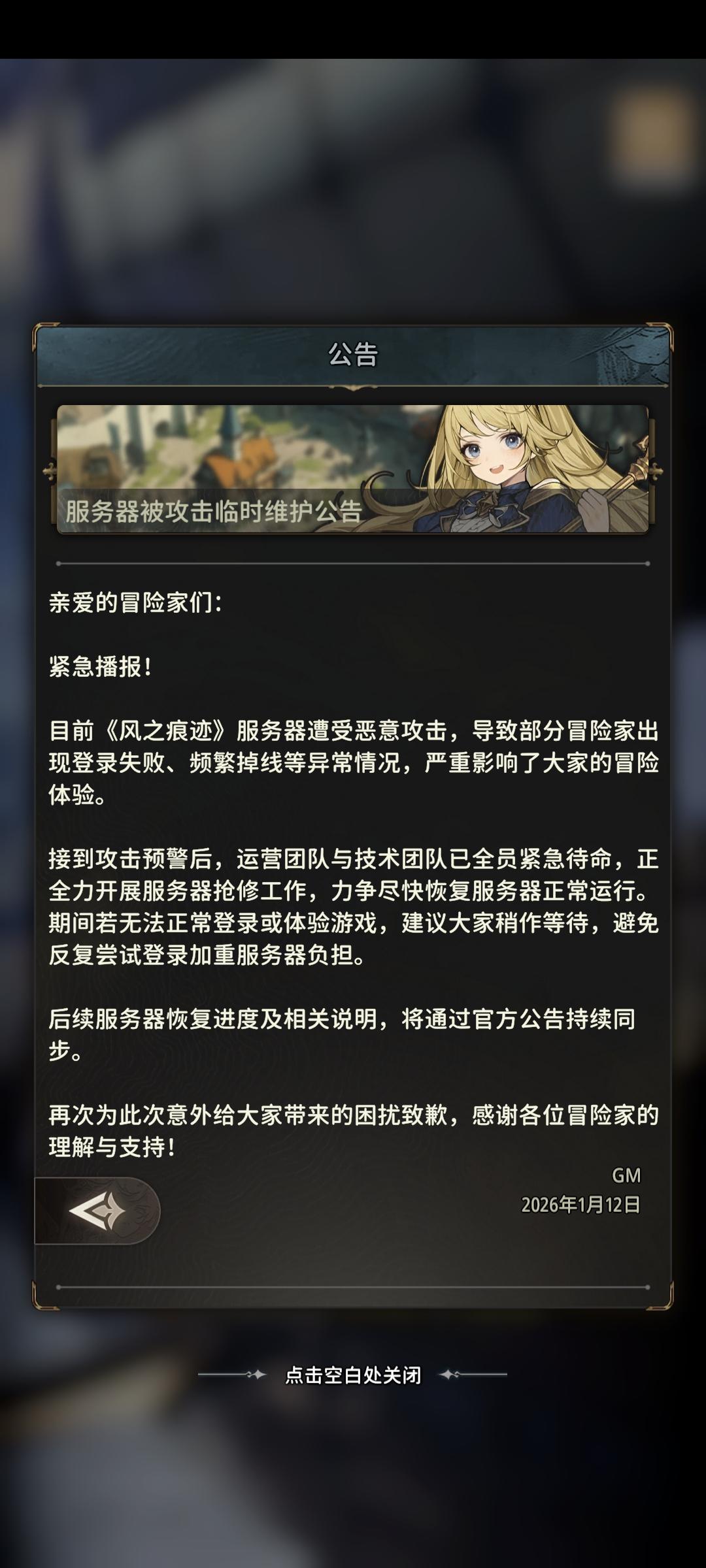 亲爱的冒险家们:经过技术小哥的全力抢修,《风之痕迹》服务器已彻底修复完毕,目前可正常登录体验游戏啦!此次服务器攻击给大家的冒险之旅带来了诸多不便,哼唧再次向各位冒险家深表歉意!为感谢大家的耐心等待与理解,我们将为全服冒险家发放专项补偿:始源系列135装等各属性武器*1魂石*1000补偿将通过游戏内邮箱自动发放,请大家及时查收~后续我们会进一步加强服务器防护能力,全力保障大家的冒险环境