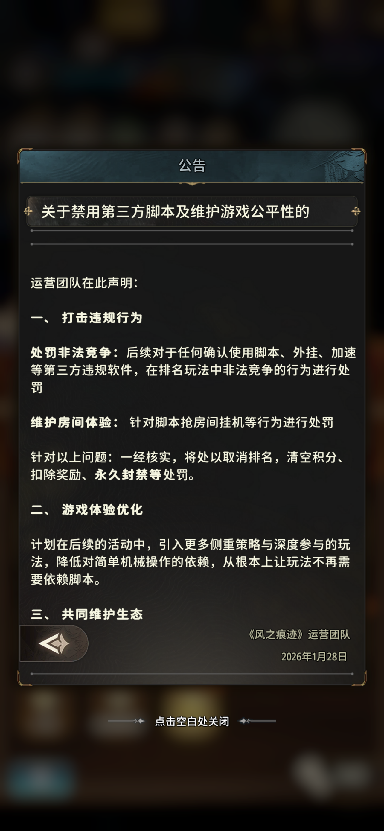 【风之痕迹】永久停服公告 亲爱的各位玩家: 时光荏苒,感恩相伴。自【风之痕迹】上线以来,我们与每一位玩家共同度过了无数个欢乐且难忘的日夜,见证了大家在游戏里的每一次冒险、每一份收获。 因业务发展调整,我们怀着万分不舍的心情遗憾通知:【风之痕迹】将于【2026年/2月/15日】正式终止运营,永久停服。 相关停服安排如下: 1. 【2026年/2月/1日】:关闭游戏充值通道,停止新