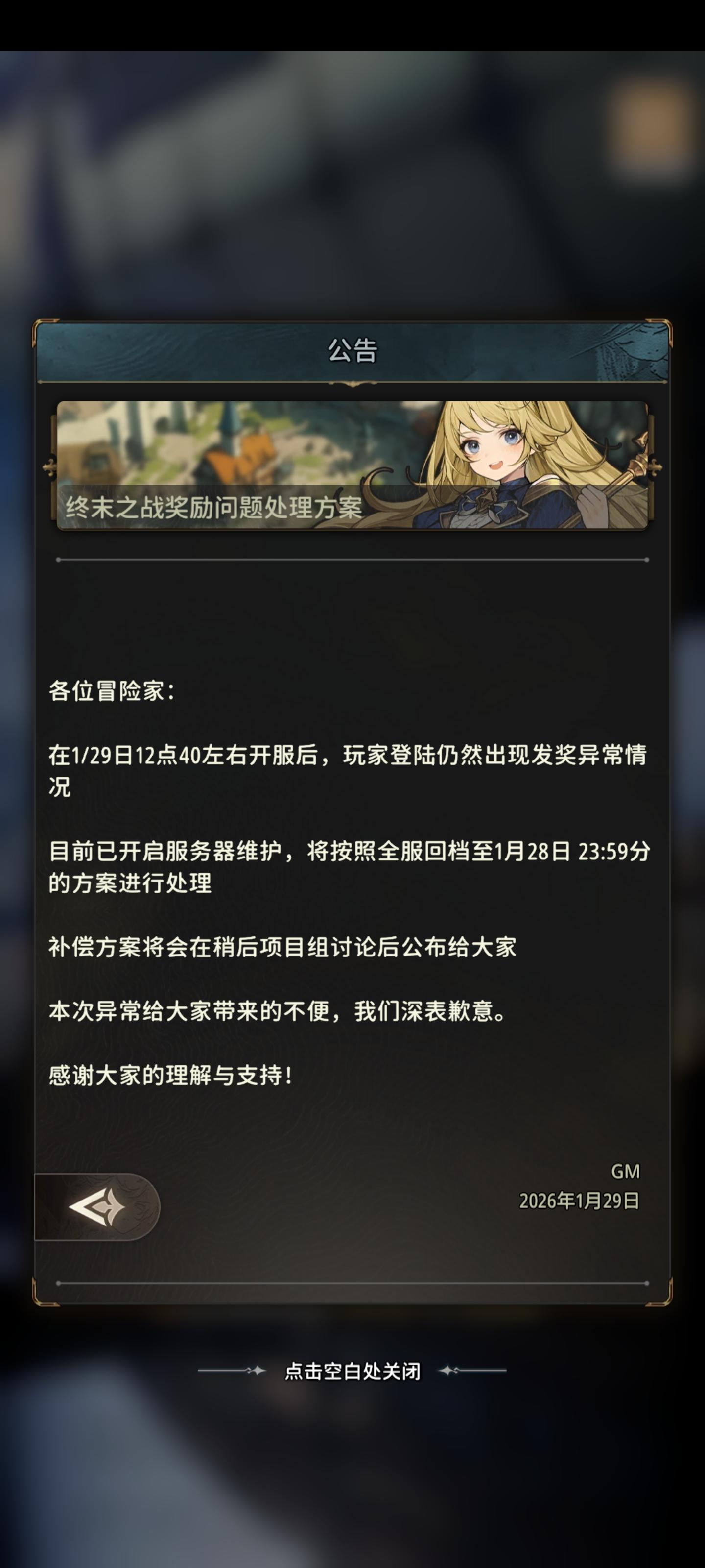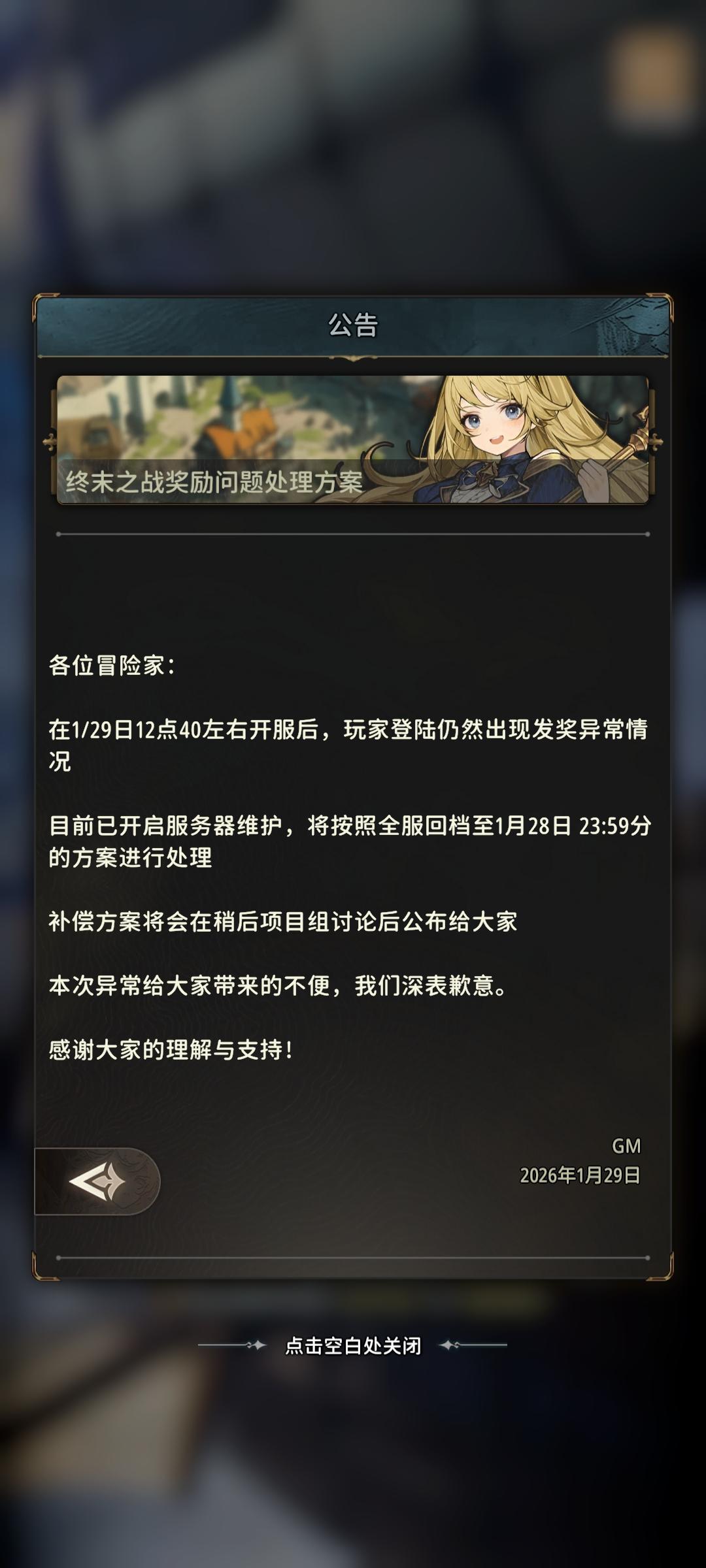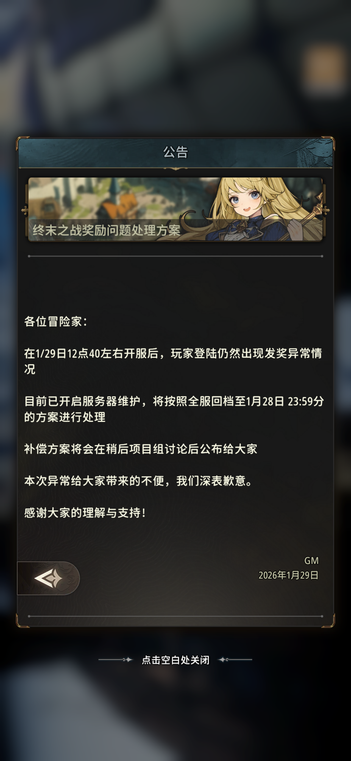 因活动发奖异常,临时停服维护,开服时间请留意后续公告。另请甄别虚假信息,切勿轻信非官方信息。