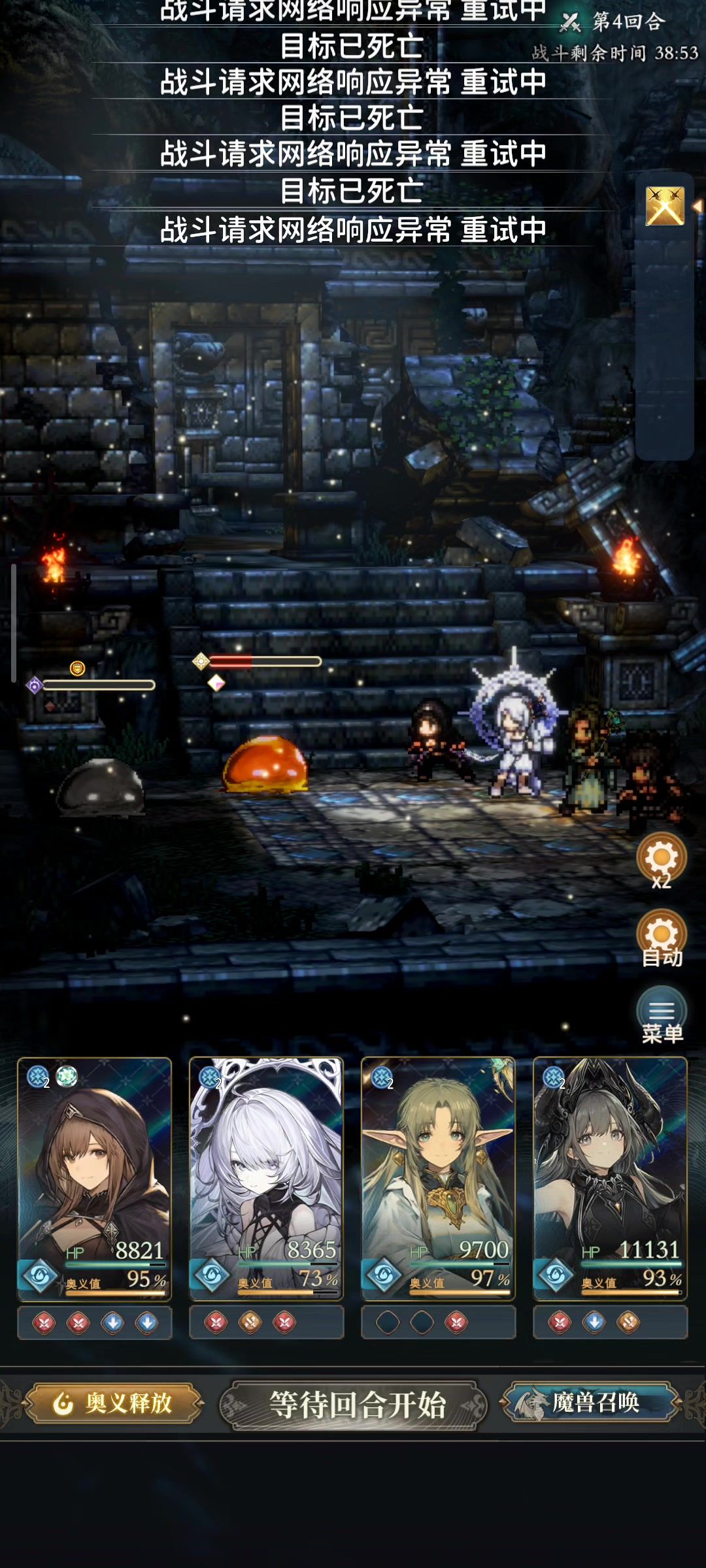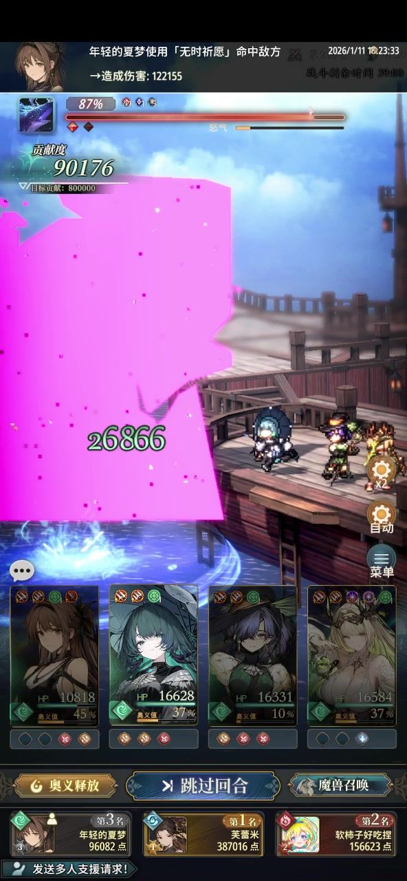 渡应该是都有的吧,所以队伍很好凑。 视频里没打过,没办法,离要求的差了110万战力。 还有就是,第二回合主角有概率开不出奥义,没被打或者二三连击的话,会差一点点。不过无伤大雅。 至于技能轴的一些描述,0号队友就是自己,1号队友就是除开自己,从左到右数第一个,剩下的以此类推。 最后聊点题外话。火队的生存能力偏弱哈,其他队伍,都有开屏障的。土队我不知道队伍还没拉起来,反正,风和水是有的。技能冷却有些过