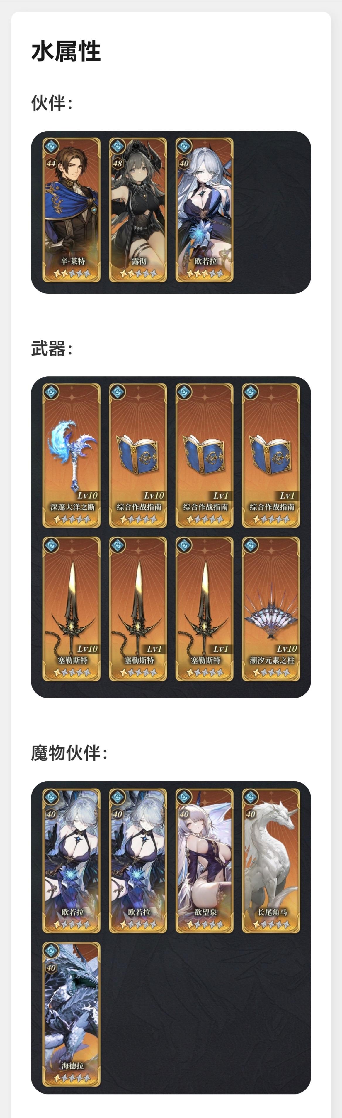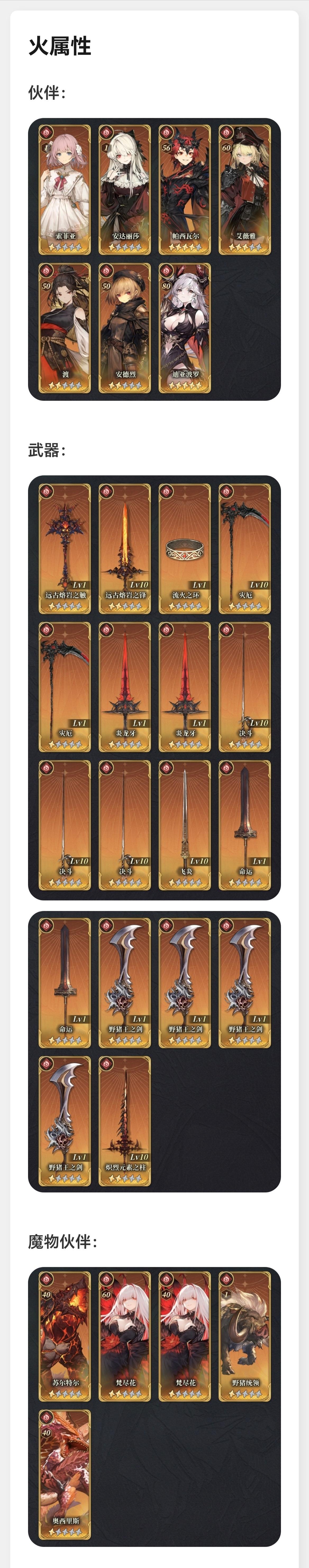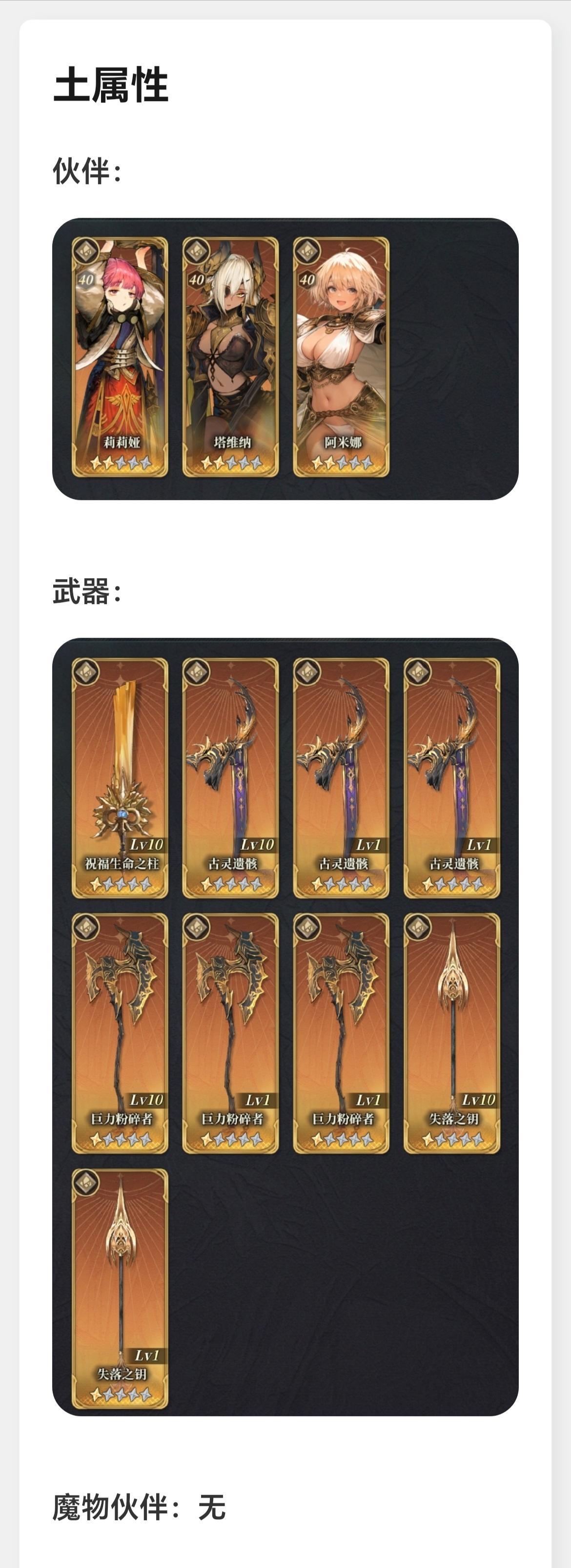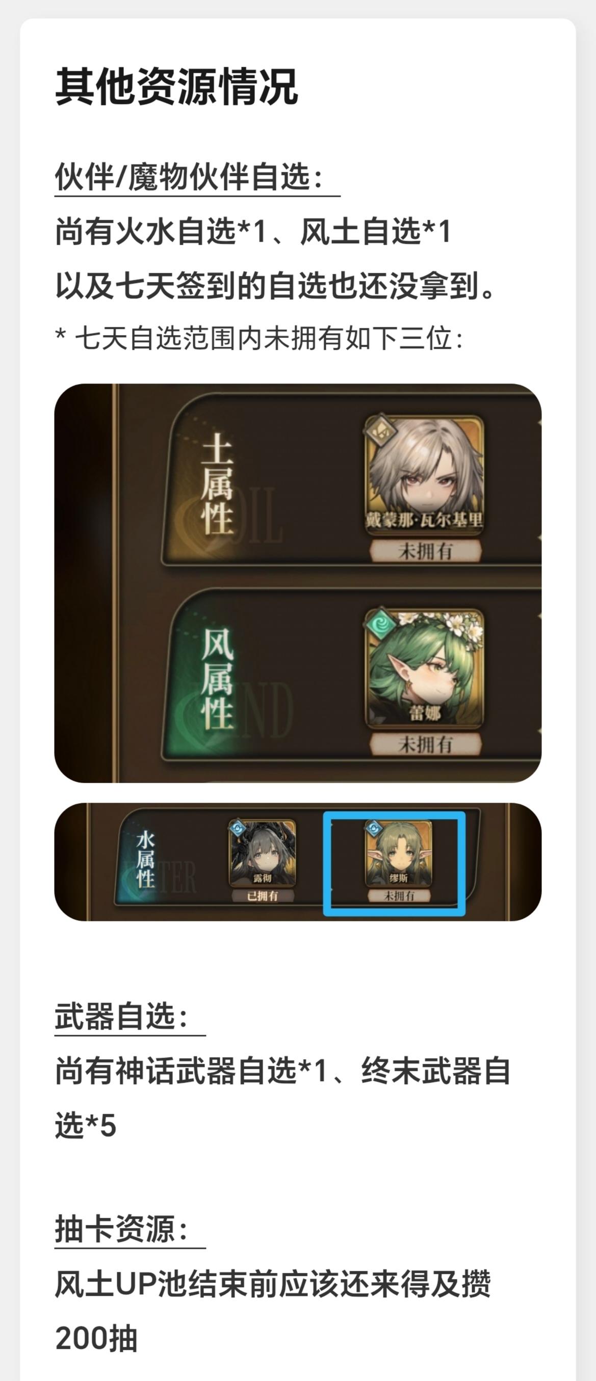目前现有的各属性伙伴、武器及魔物伙伴情况按火、水、风、土属性排列顺序如图1-4。其余资源情况如图5,包括火水自选*1、风土自选*1,七天签到的自选*1、补偿送的神话武器自选*1、终末武器自选*5,以及当期风土池UP结束前能再攒200抽。首充伙伴暂未获取。配队的攻略自己大致看了一些,但黑话太多了实在看不明白,所以还是想请教一下各位大佬:1.首充伙伴有必要获取吗?2.以我现有的box情况,是继