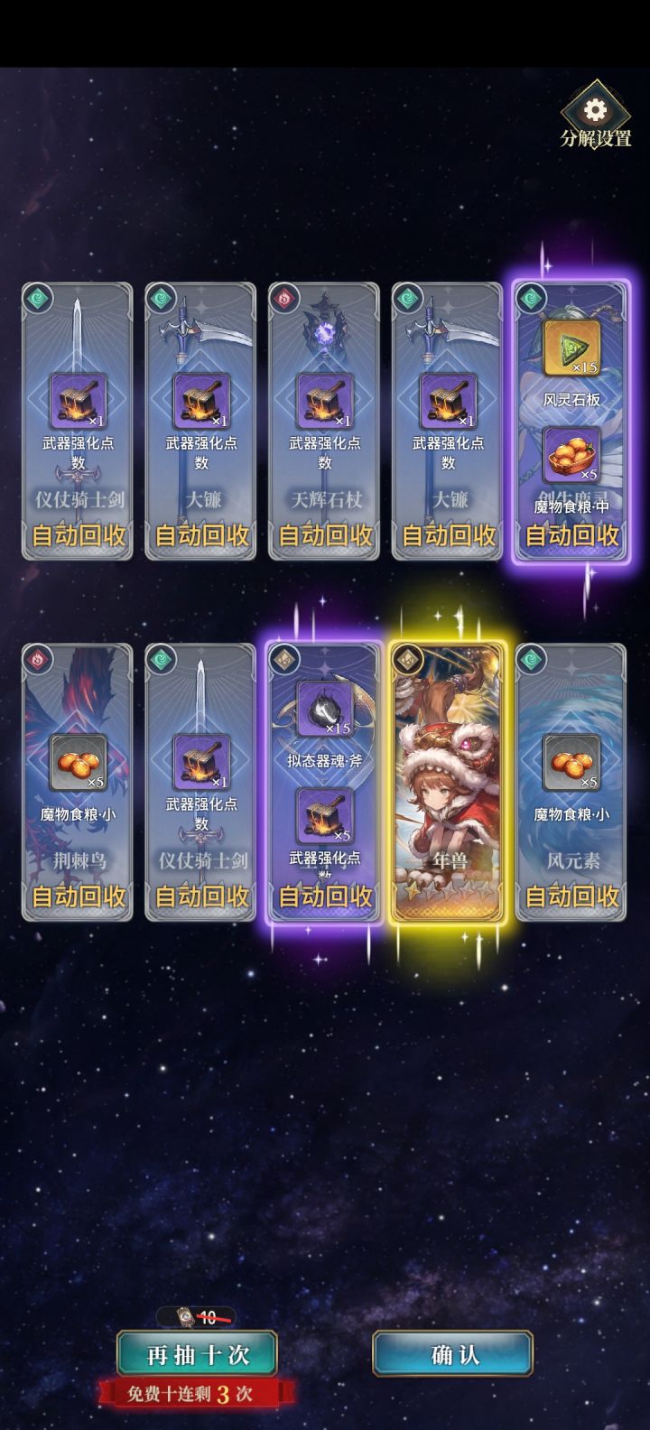 今天的免费100抽捞到了三个lm和年兽虽然没有赤兔但我可以拿自选换,昨天中10抽+活动送的10票自费160抽一井无UP但有两个lm+水老王也算不那么亏,要是昨天不自费的话那自费10抽就能抽一井一了,还是急了,目前还有90抽能再井,后面保底送50抽,还有送的10票没用,也就是说这次自费190抽能拿3个UP,希望后面能中个几次二三十抽的让我自费160抽拿三个UP